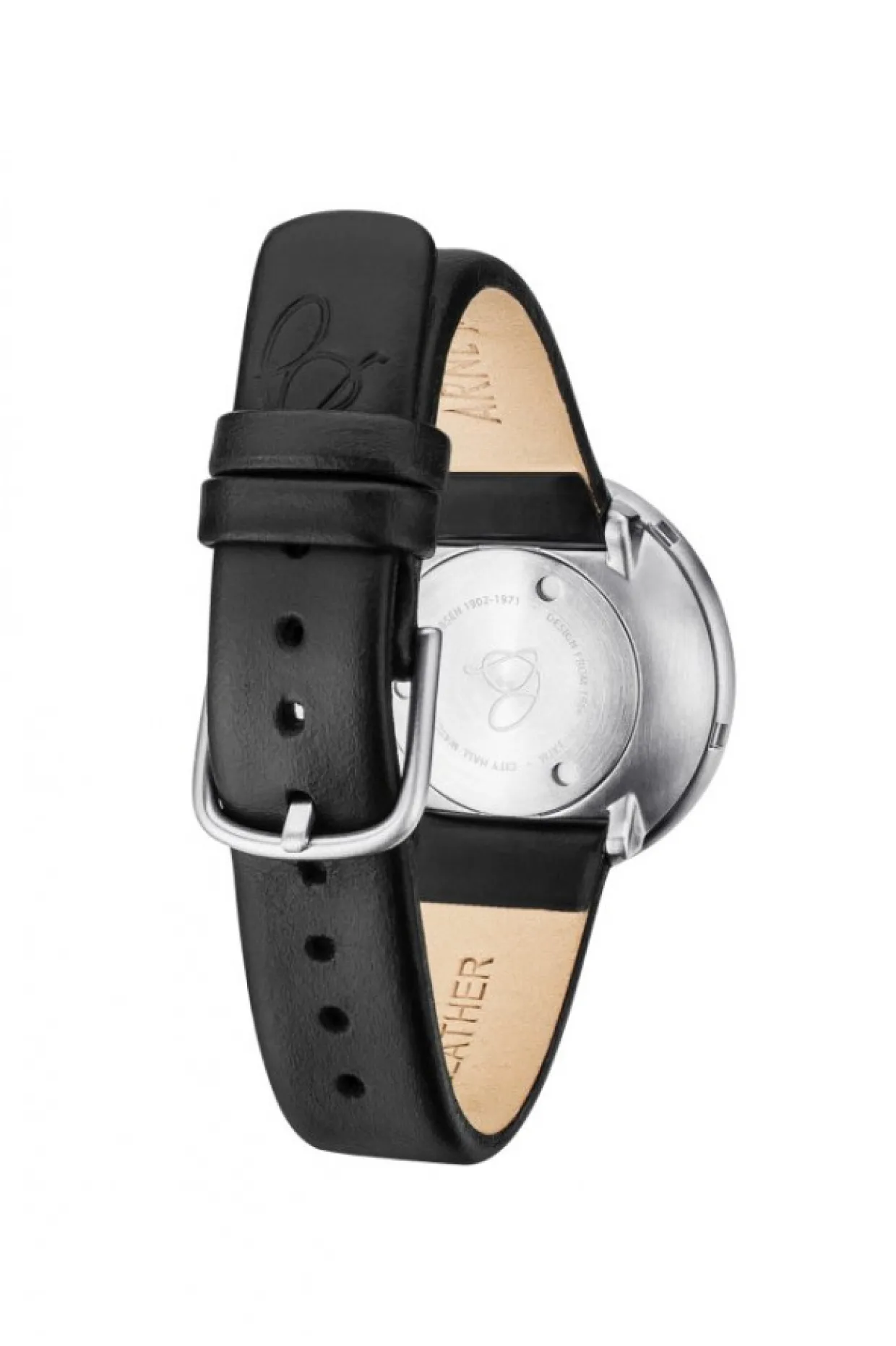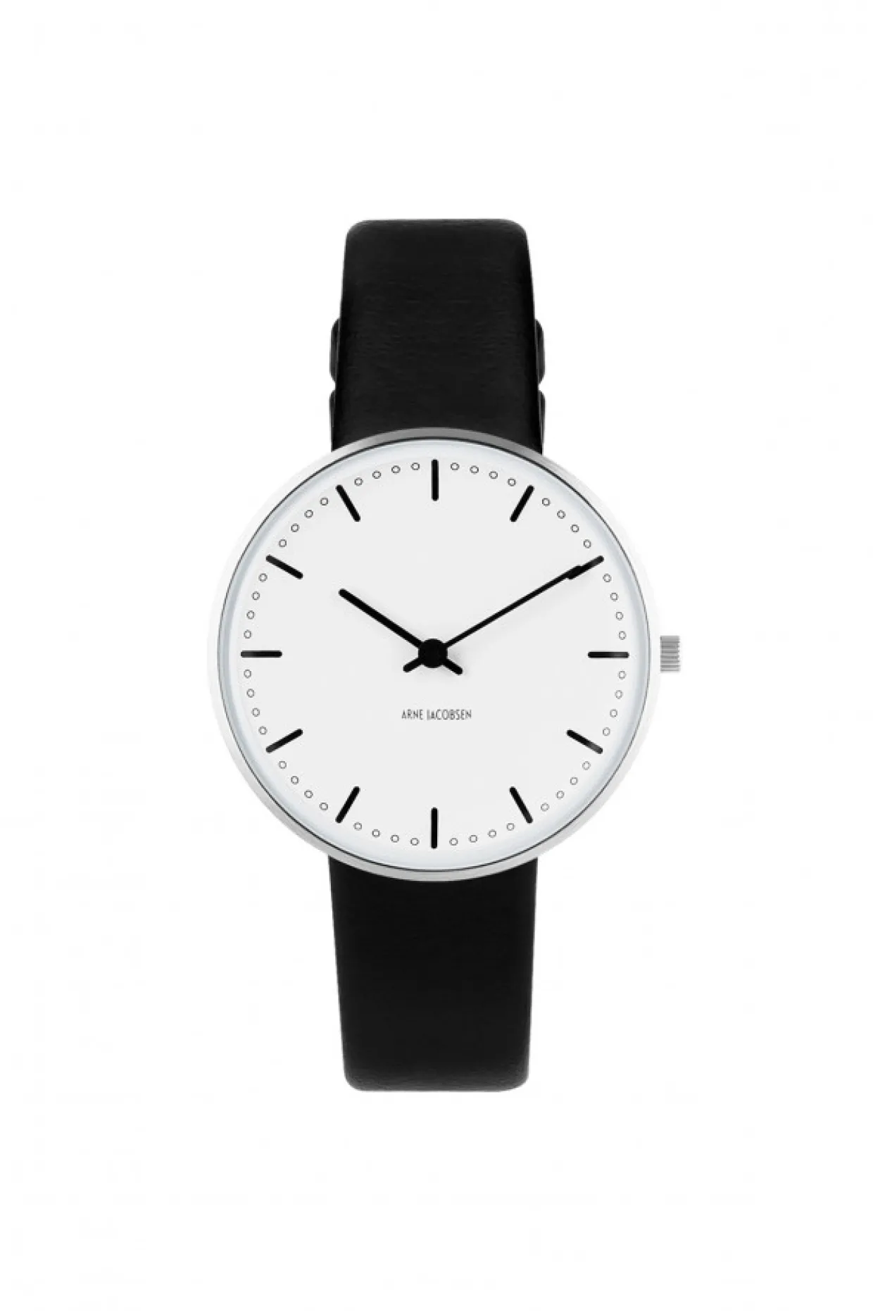 Armbåndsur 34mm urskive i mat stål med sort læderrem. Modellen fås også i 40mm urskive.