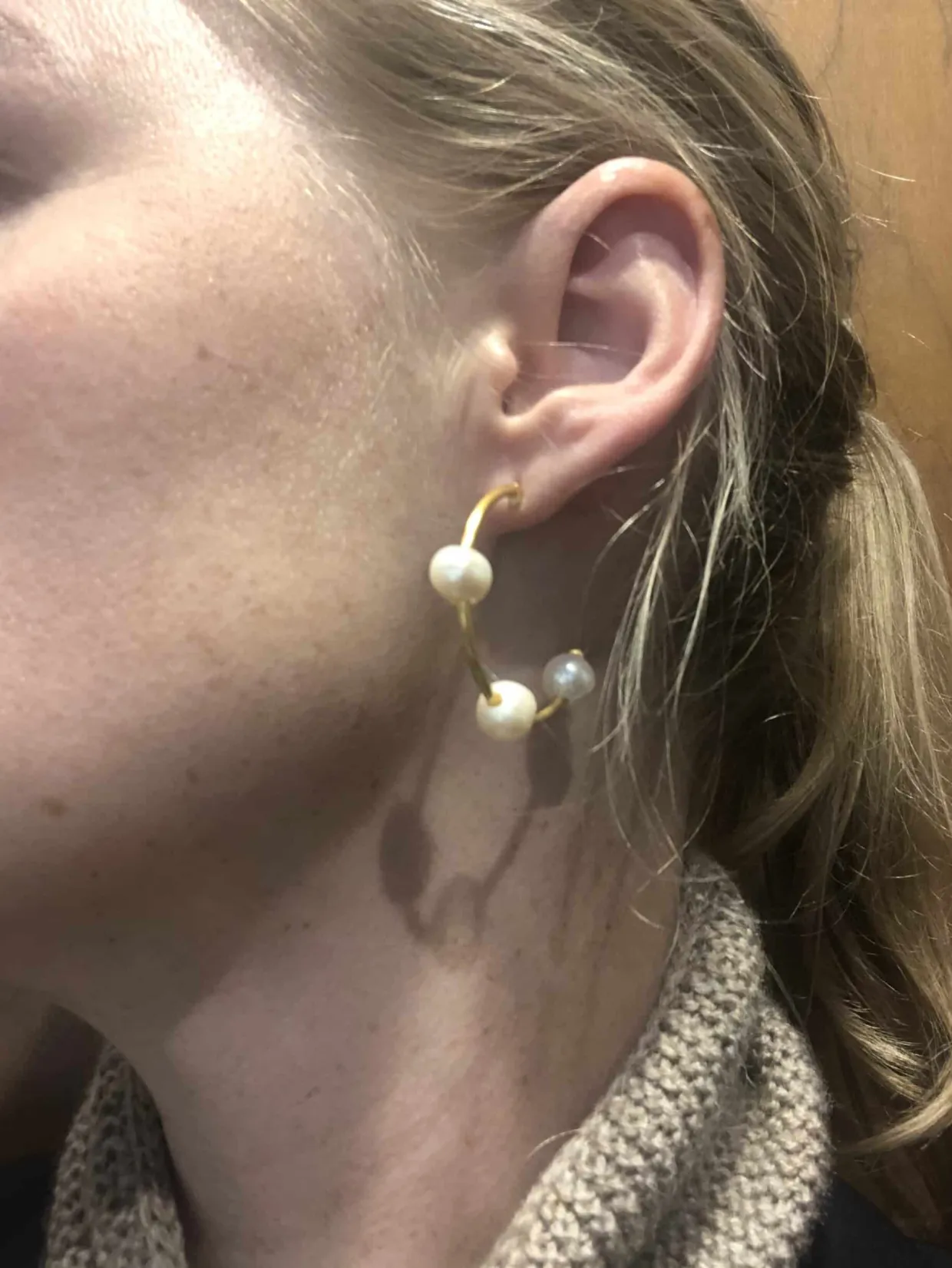 Alle smykker fra bybiehl er produceret i genanvendeligt sølv med en forgyldt mat overflade, disse øreringe er en stor hoop med 3 hvide ferskvandsperler.
