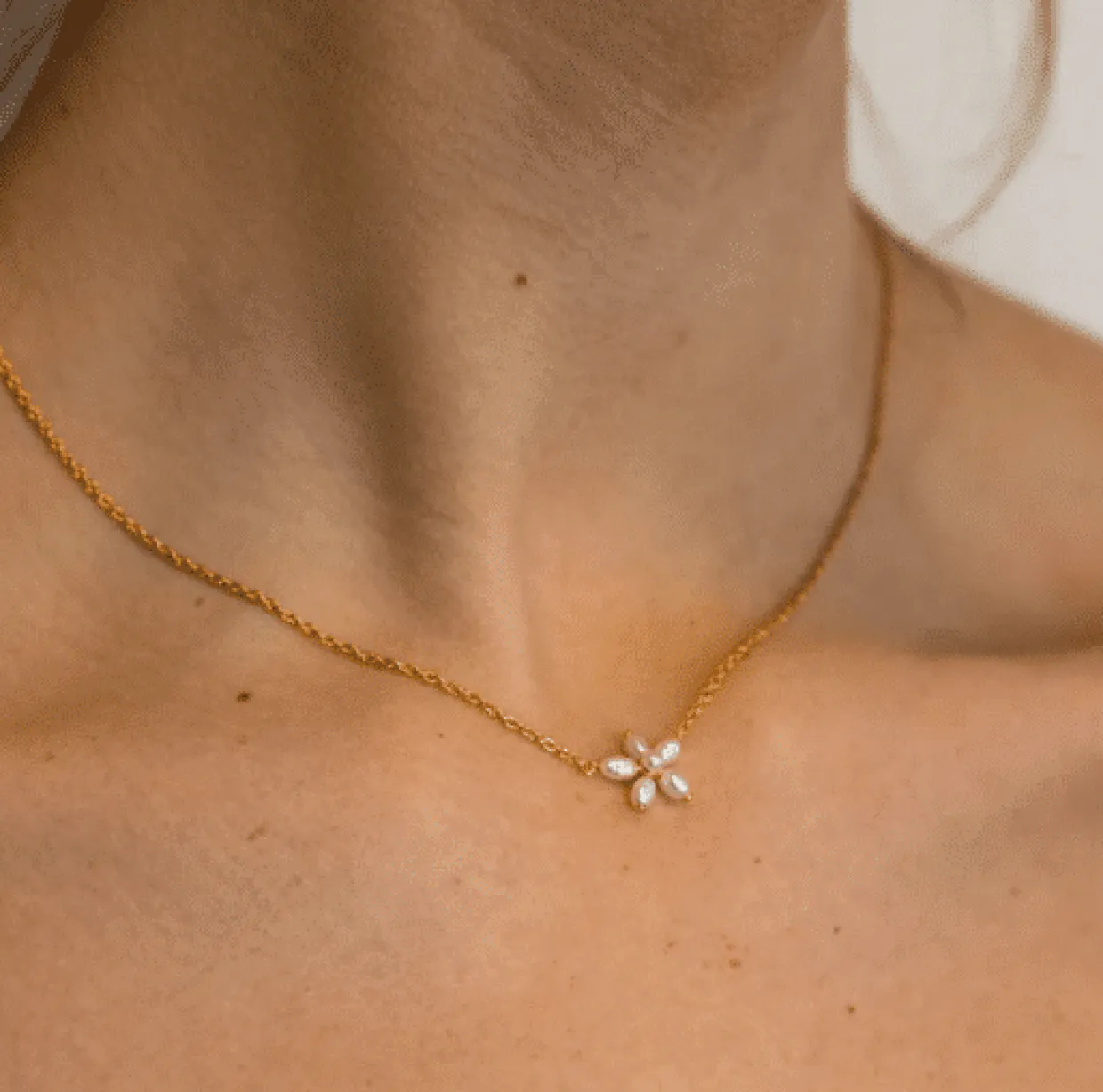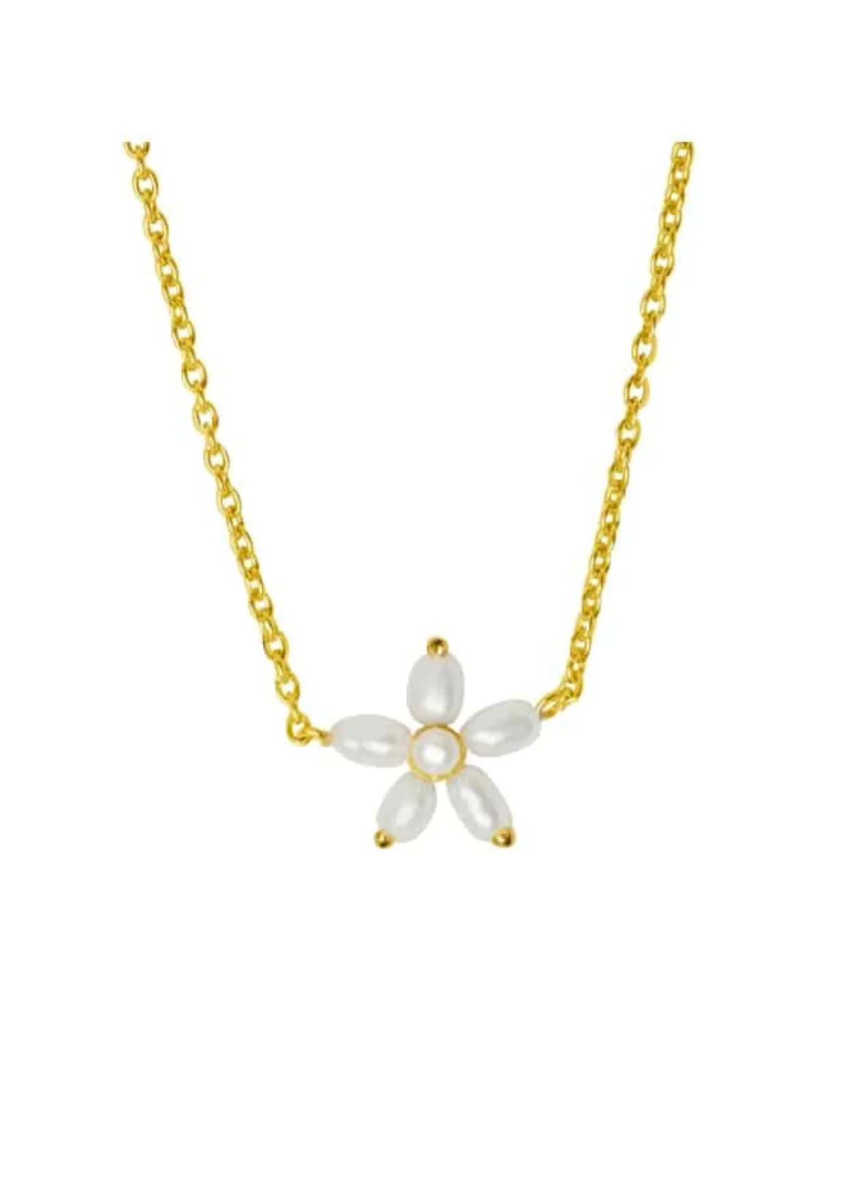 Halskæden er fremstillet i genanvendeligt forgyldt sølv med 6 hvide ferskvands perler, formet som en blomst.