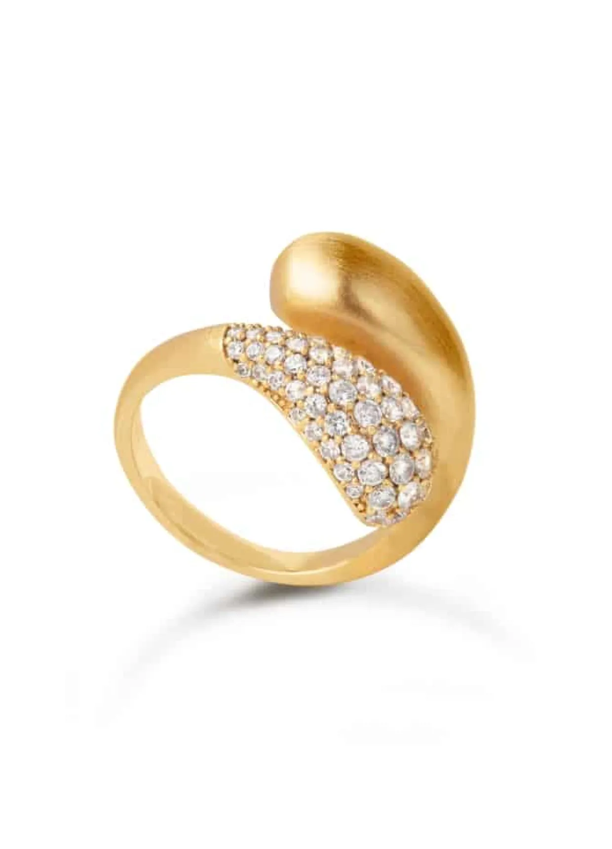 Smuk og elegant ring, med en blød snoning omkring fingeren. På den ene side er ringen paveret med små hvide syntetiske zirkonia. Ringen er lavet af 100% genbrugs sterling sølv som er blevet belagt med guld. Ringen findes i størrelse 48, 50, 52, 54, 56, 58 og 60.