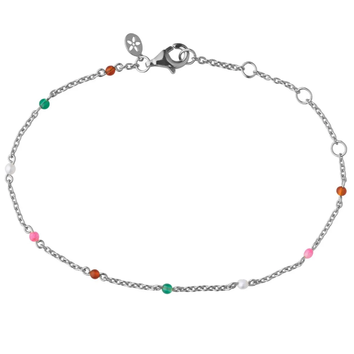 Super flot sølv armbånd med grøn agat, rød agat hvid perle og lyserød farvet jade sted fordelt på armbåndet