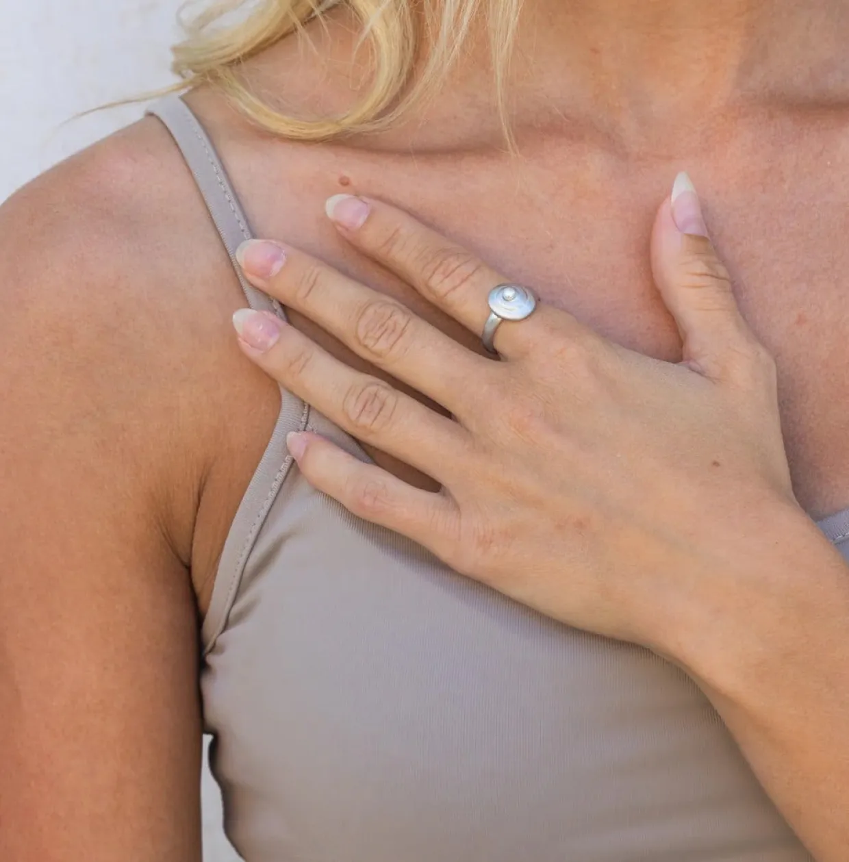 Ringen er en smuk ring designet i sterlingsølv og prydet med en elegant perle. Ringen kombinerer klassisk skønhed med et moderne design og symboliserer havets ro og elegance. Den enkle, men sofistikerede stil gør den perfekt til både hverdag og særlige lejligheder. Perlen tilføjer et naturligt og tidløst touch, mens sølvet giver et luksuriøst og varigt look.