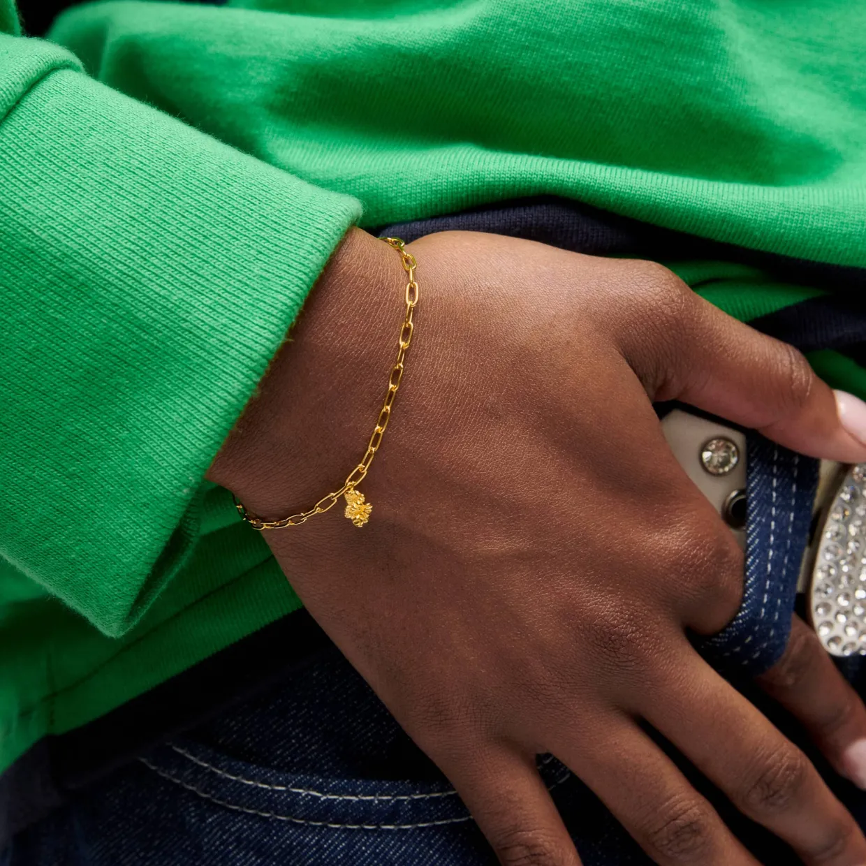 Armbåndet har en delikat kæde, der omfavner håndleddet smukt, og det kan være prydet med små detaljer eller charm, der tilfører en unik karakter. Den varme gyldne tone skaber en smuk kontrast til hudtonen og kan bæres til både hverdag og festlige lejligheder.