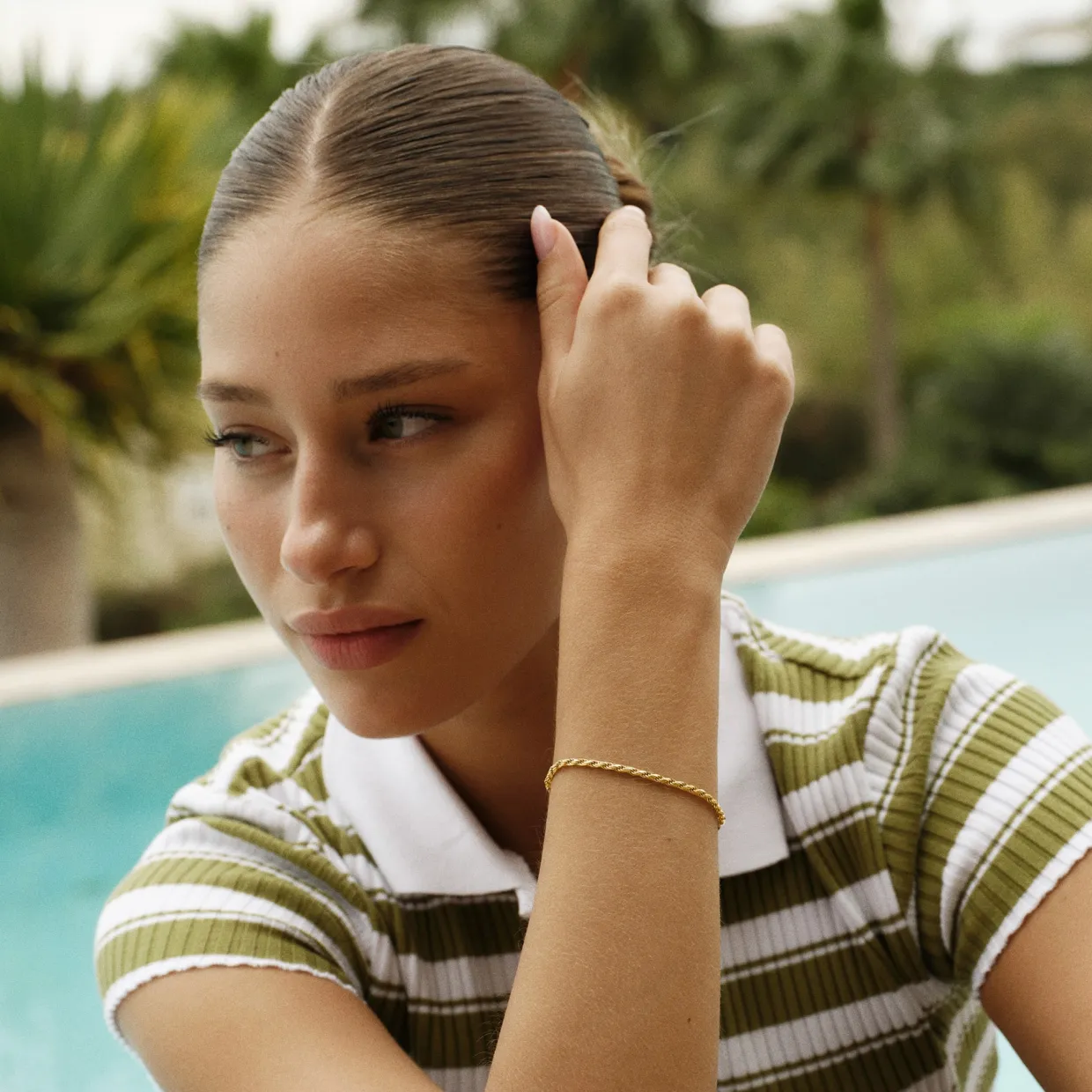 Det kraftige twist giver armbåndet karakter og dybde, mens den varme forgyldning tilfører et luksuriøst touch. Armbåndet kan bæres alene som et stilrent statement eller kombineres med andre armbånd for et mere personligt og lag-på-lag look.
