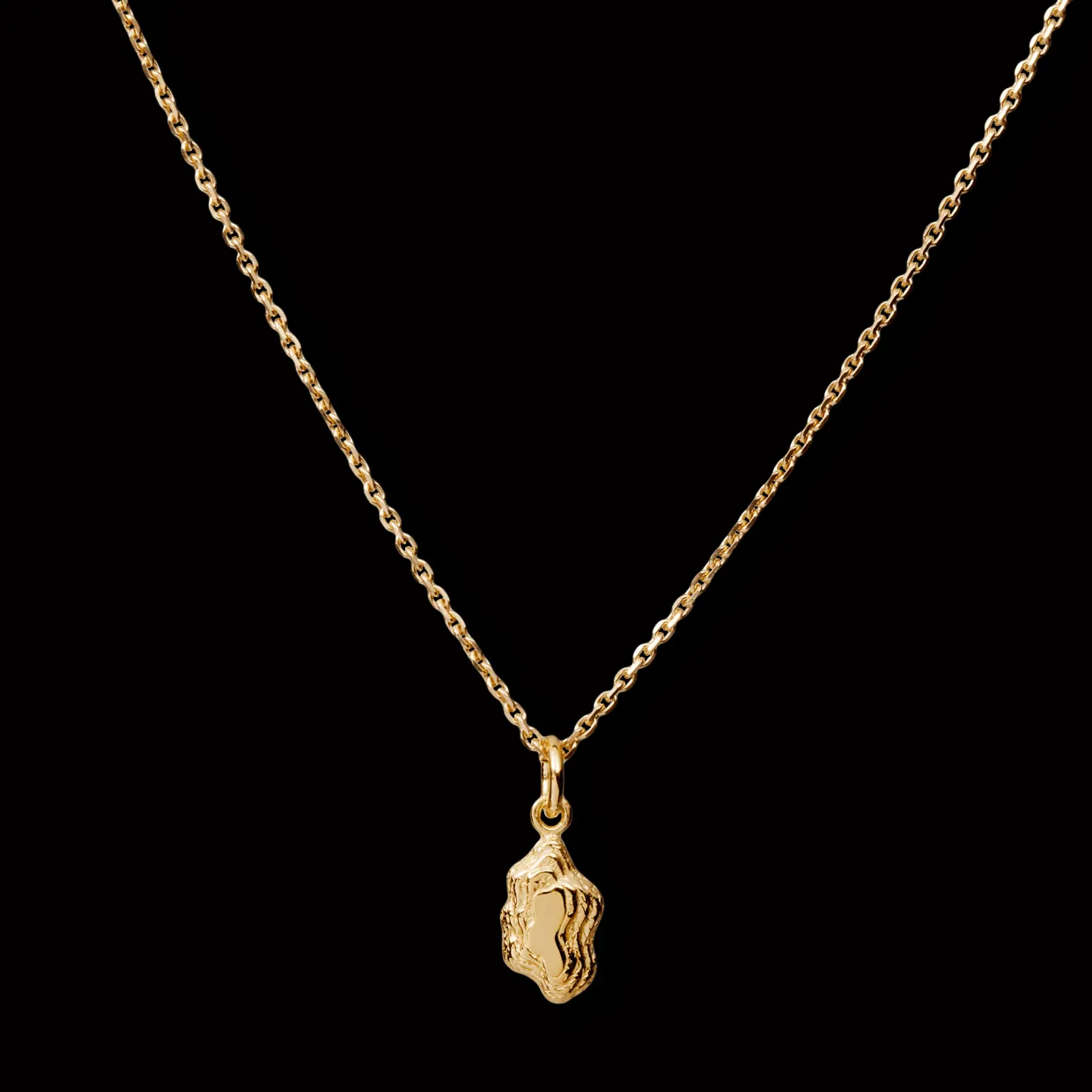 Den forgyldte sølvfinish giver halskæden en varm og lysende glød, der fremhæver dens unikke form og struktur. De små nuggets tilfører et legende og sofistikeret element, som gør halskæden velegnet til både hverdag og festlige anledninger.