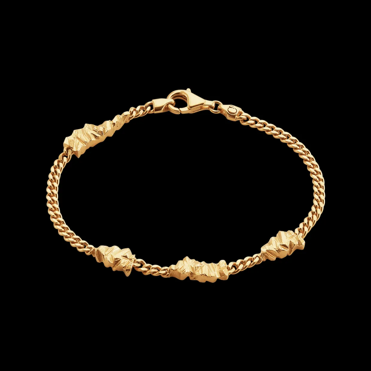 Armbåndet er fremstillet i sterlingsølv (925) og forgyldt med 22 karat guld, hvilket giver en varm, gylden glans, der smukt fremhæver panzerkædens karakteristiske struktur. Hver led er nøje formet for at skabe en perfekt balance mellem tyngde og komfort, så armbåndet både føles luksuriøst og behageligt at bære.