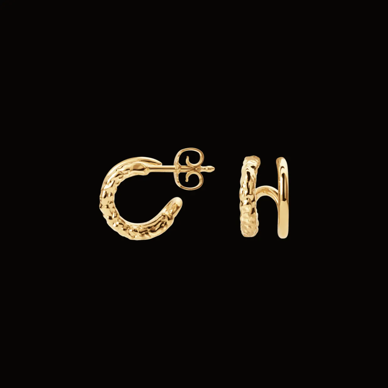 Det karakteristiske tvistede dobbelt-design giver et unikt, skulpturelt look, som fanger opmærksomheden uden at råbe højt. Den lille størrelse gør dem perfekte til både hverdag og fest – alene eller i kombination med andre smykker for et personligt udtryk.