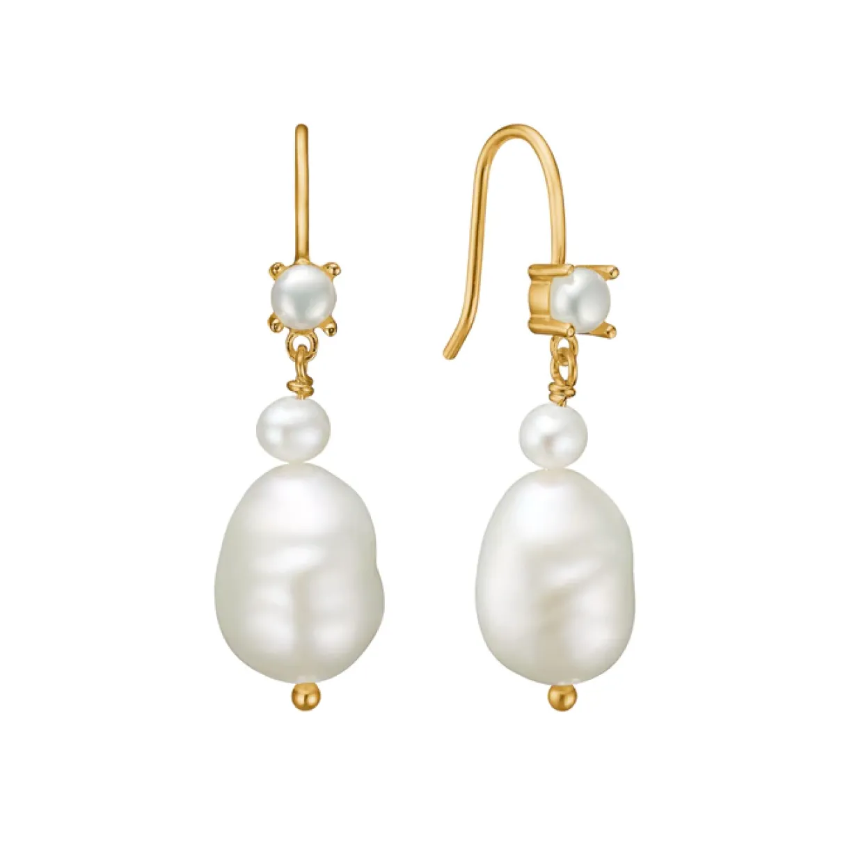 Disse elegante ørehængere er fremstillet i guld belagt sterling sølv. Øreringene er sat med hvide ferskvands perler, i forskellige størrelser i organiske former. Øreringene er fra brand serien ‘carré arhive’ hvor du finder klassiske smykker sat med smukke ædelstene.