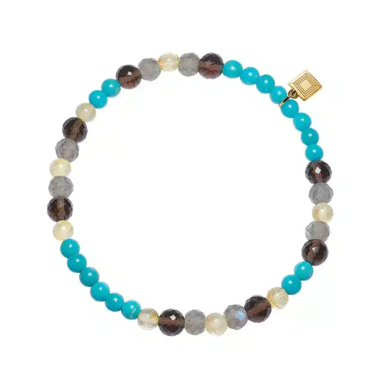 Armbånd i elastik med ægte labradorit, gylden rutil kvarts, røg kvarts og turkis. Armbåndet måler 17,5 cm og kan bruges til enhver lejlighed.