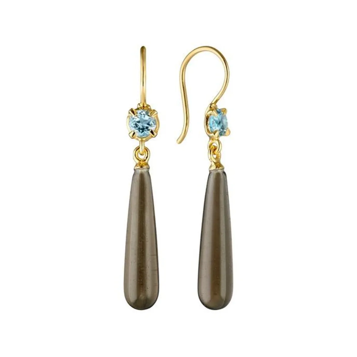 Disse smukke ørehænger er fremstillet i sterling sølv og belagt med rød guld. Øreringene er sat med blå topas og røg kvarts.