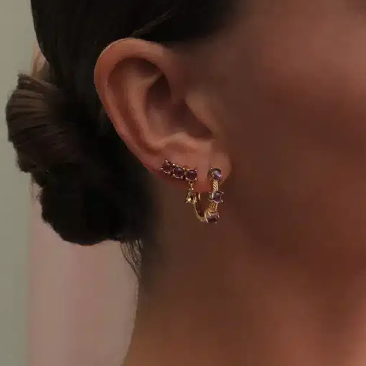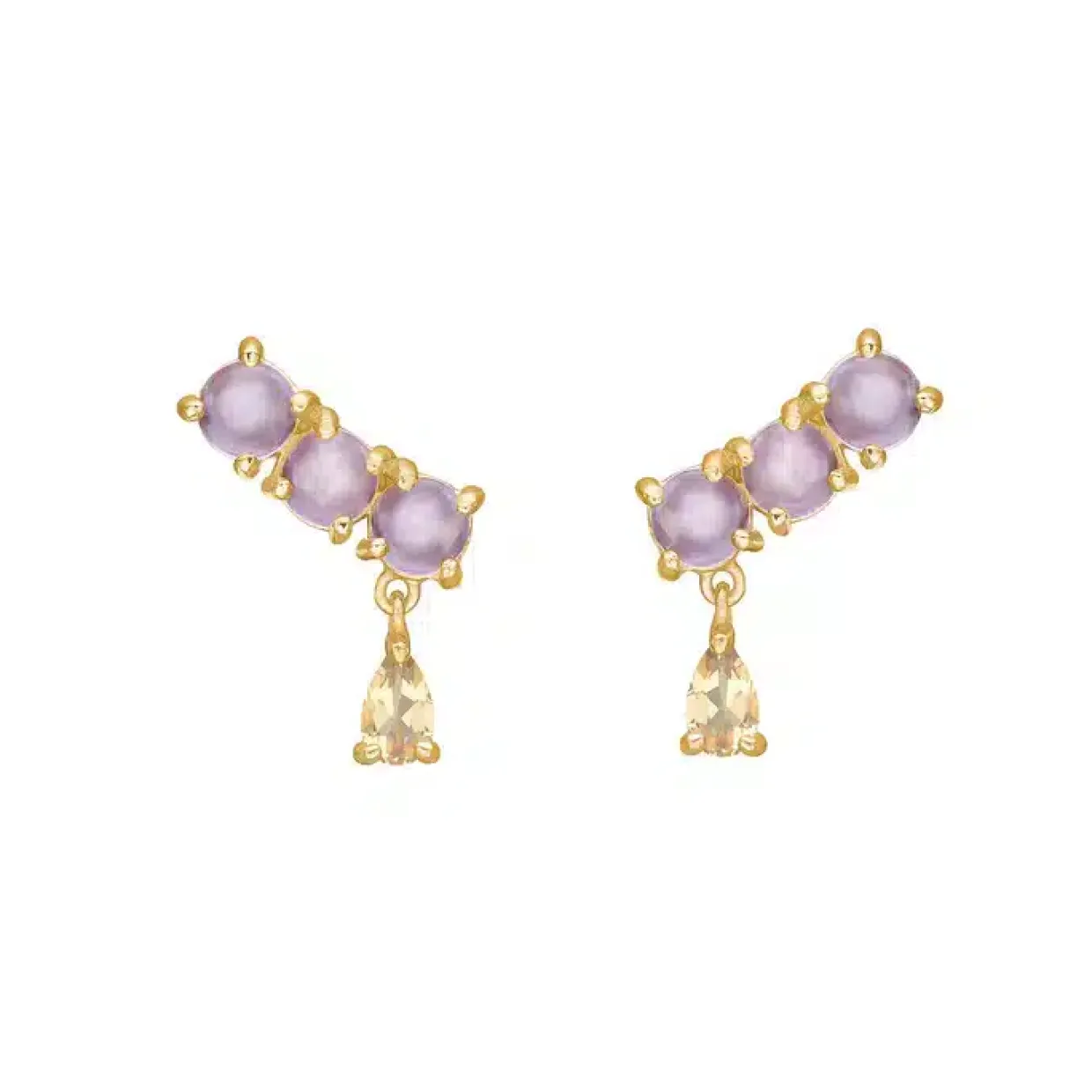 Elegante øreringe med tre stk. Ametyst og en champange kvarts isat i hver ørestik.