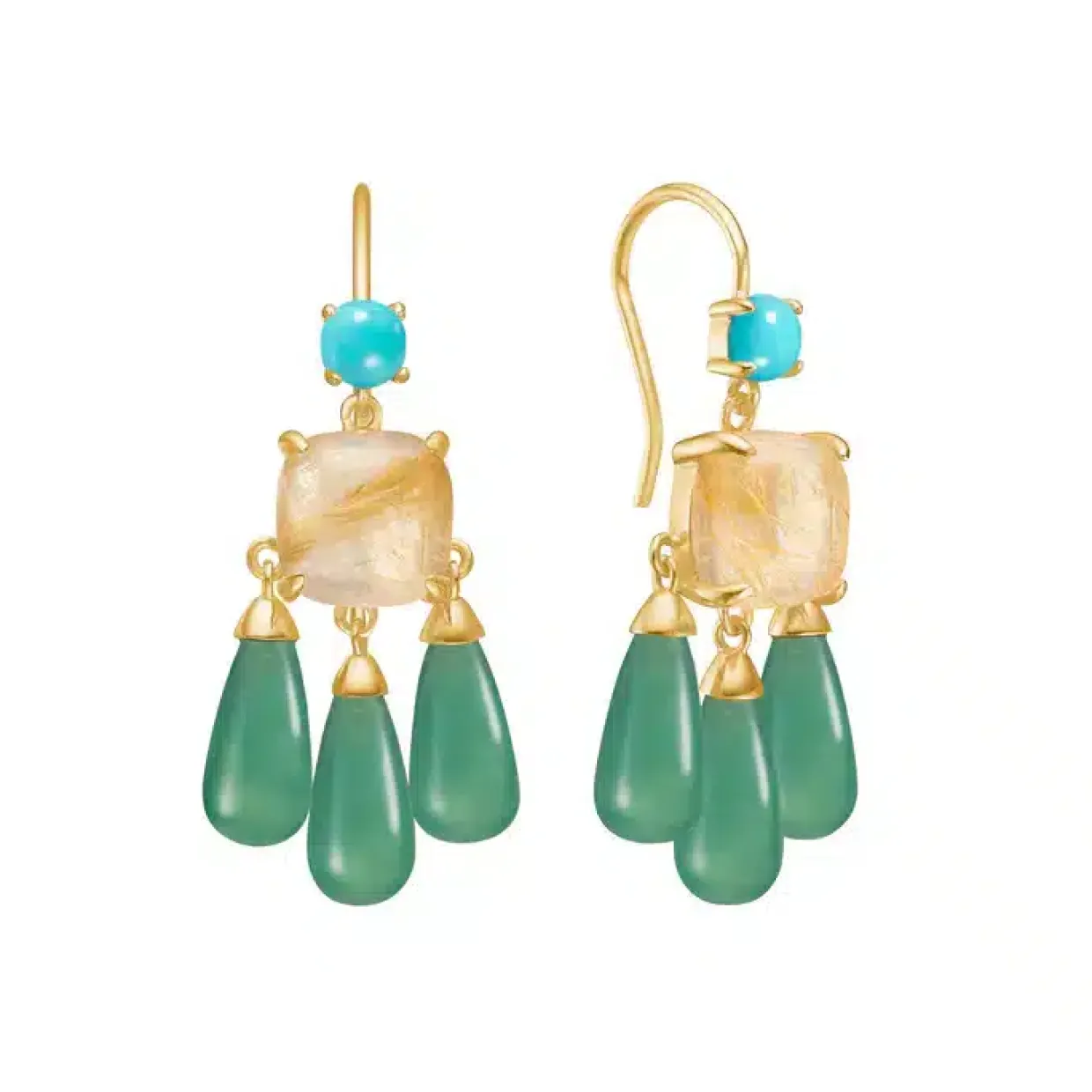 Smukke øreringe i forgyldt sølv med en turkis, en gylden rutil kvarts og tre grøn agat, isat i hver ørering.