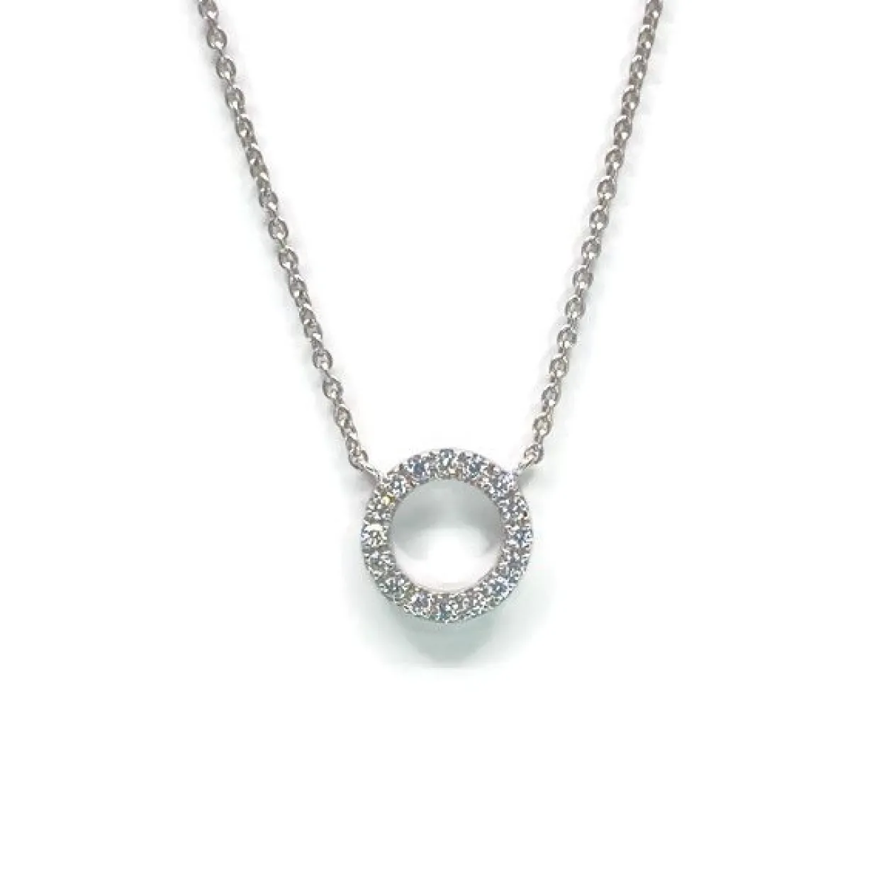 14 karat hvidguld halskæde cirkel med 16 brillanter. Kæden er også i 14 karat hvidguld med mønstret rund anker i en tråd 0,30 mm. Længden på kæden er 42 cm plus et forlænger stykker på 3 cm, så i alt en længde på 45 cm. De 16 brillanter er i kvaliteten wesselton/si og med en vægt på 0,13 carat.