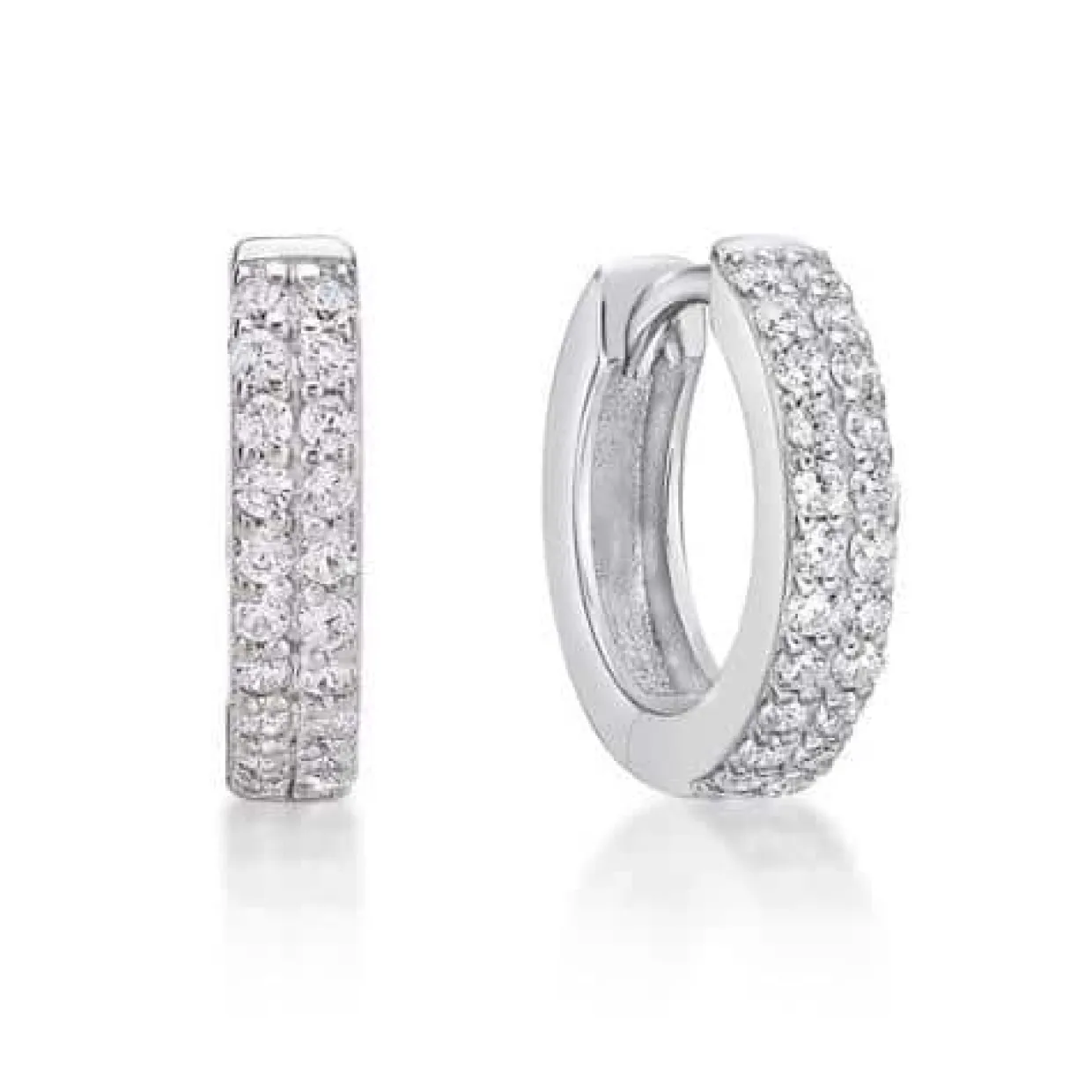 Sølv øreringe som creol med syntetiske zirkonia. Creolerne har en bredde på 3 mm og en diameter på 14,5 mm. De syntetiske zirkonia sidder i to rækker på forsiden.