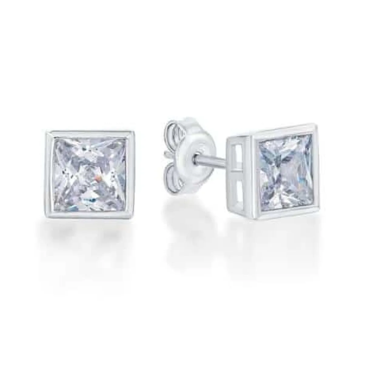Sølv øreringe på stik med firkantet syntetisk zirkonia. Den syntetiske zirkonia måler 6×6 mm og sidder fast med sølv kant hele vejen rundt.