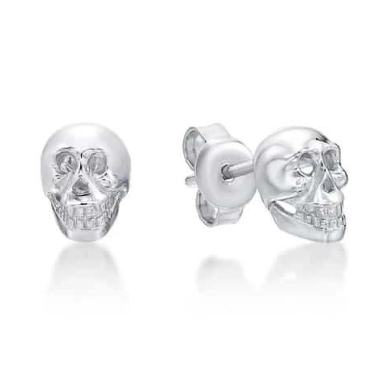 Sølv øreringe på stik med dødningehoved. Øreringene er rhodineret så de holder sig pænere i længere tid. Øreringene findes også i en størrelse større.