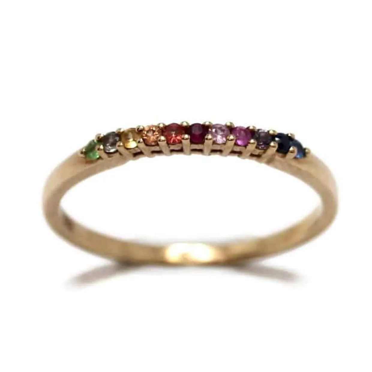Denne farvestrålende Rainbow-ring fra Christoffersen Jewellery er fremstillet i 8 karat guld og dekoreret med en række ægte ædelsten i skiftende farver. De smukke sten skaber en livlig regnbueeffekt, som tilføjer et legende og unikt udtryk til ringen. Perfekt til dig, der ønsker at tilføje et farverigt twist til din smykkesamling og bære et smykke, der skiller sig ud og spreder glæde ved enhver lejlighed.