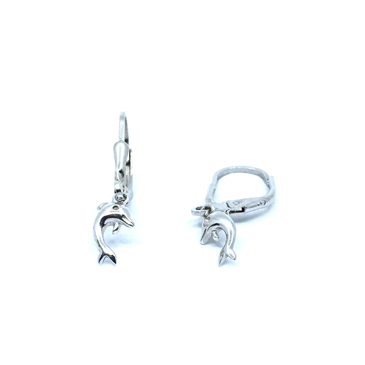 Sølv børne øreringe med delfin. Øreringe er på bøjle med lukke lås. Øreringene er rhodineret så de holder sig pænere i længere tid.