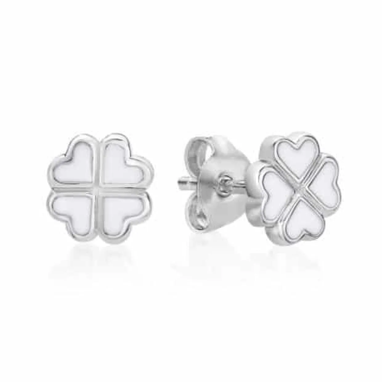 Sølv børne øreringe på stik med firkløver. Firkløveren er med hvid emalje og måler 12 mm i bredden. Bladene er hjerte formet, så det giver et flot spil på øret.