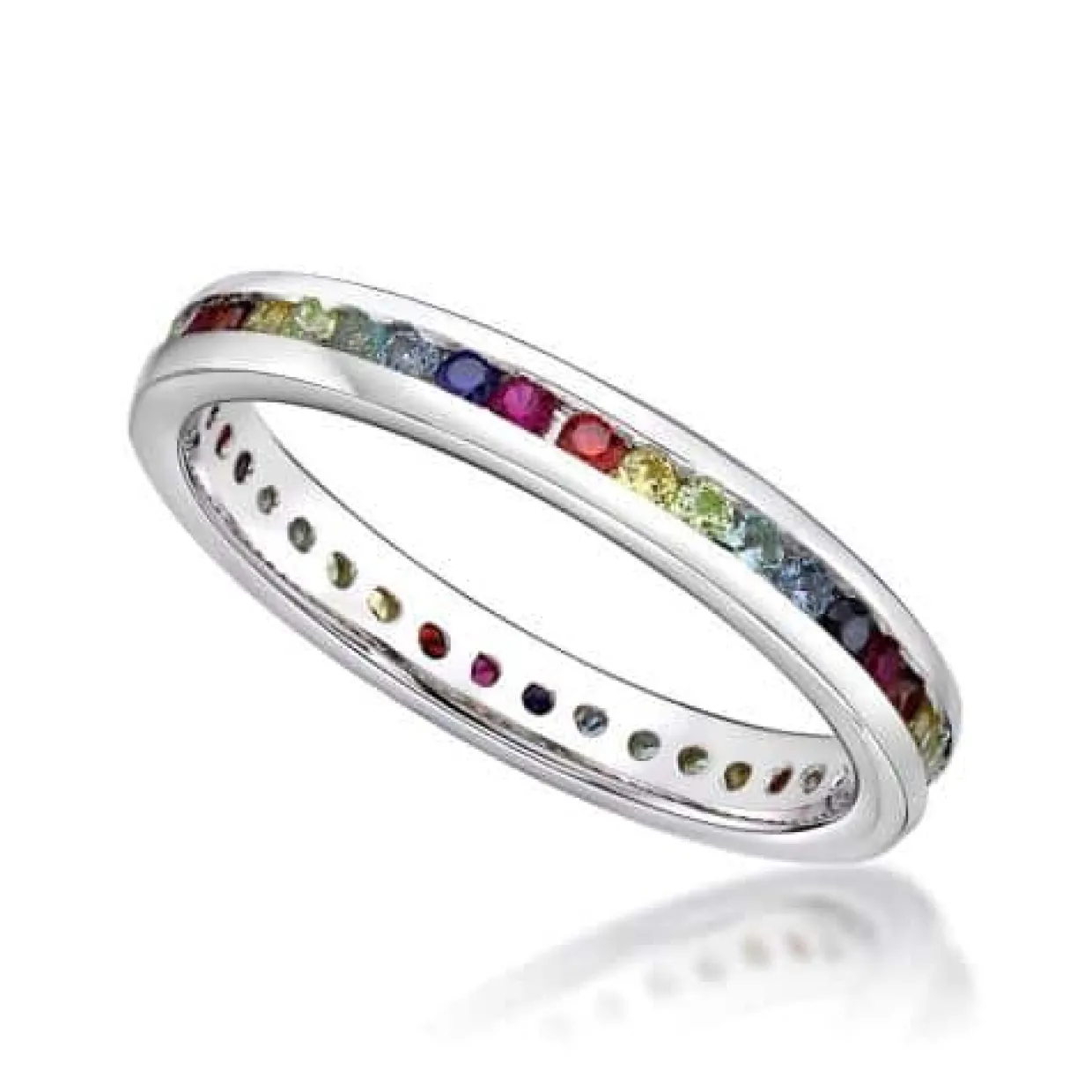 Sølv ring med farvede syntetiske zirkonia. De farvede syntetiske zirkonia sidder hele vejen. Ringen måler 2,80 mm i bredden og er god til at sætte sammen med andre ringe.