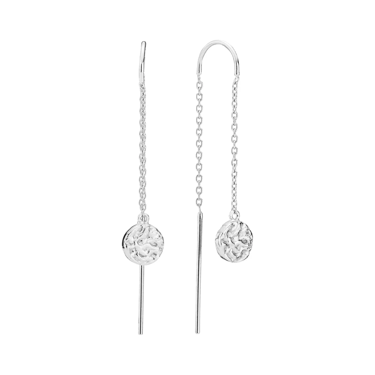 Sølv øreringe som hænger med rustik plade. Pladen har en diameter på 7 mm. Ørehængerne trækker man igennem øret, men er lavet med bøjle så de sidder pænt.
