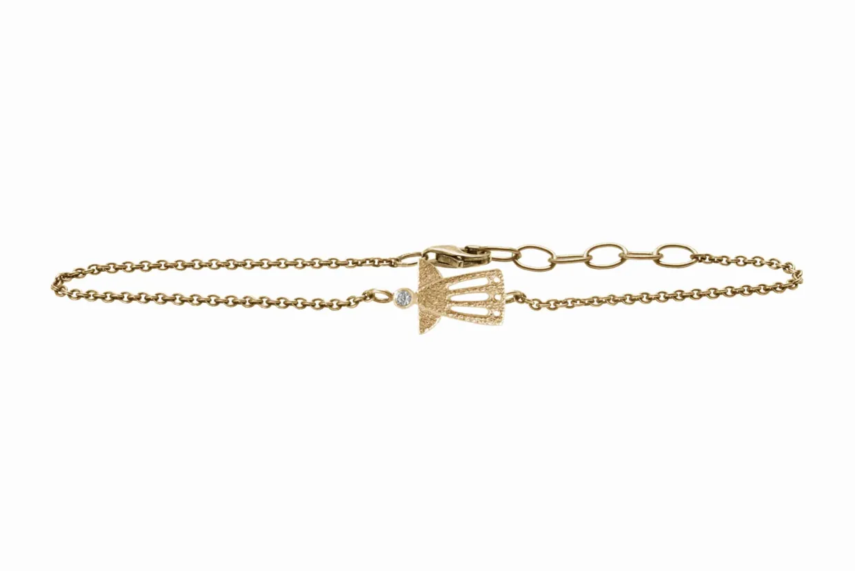 Sølv forgyldt armbånd med engel. Englen er åben og med en syntetisk zirkonia. Armbåndet har en længde på 18 cm, hvor der er monteret et forlænger stykke, så det kan blive op til 20 cm.