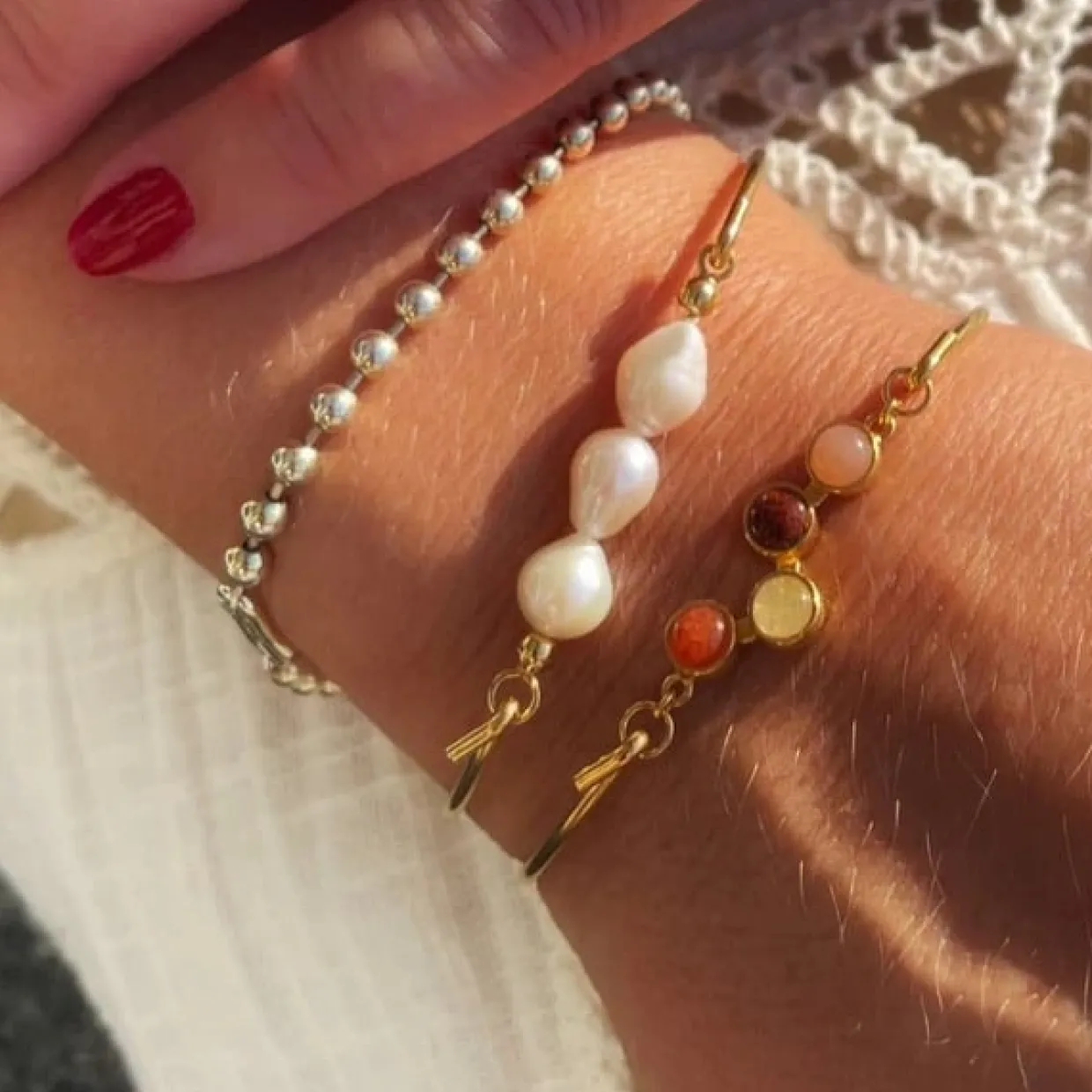 Toppen har en bredde på 5 mm med mixet ædelstene, som er rød aventurin, peach månesten, rød jasper og gul aventurin.