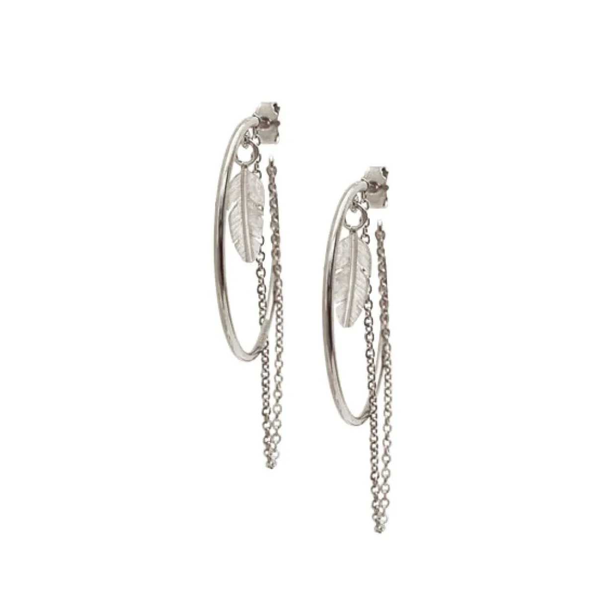 Disse smukke creol øreringe er håndlavet og fremstillet i sterling sølv som er rhodium behandlet i overfladen. Øreringene er designet med ørestik, og har en fjer og en kæde påloddet øreringen som giver den et unikt udtryk. Øreringen måler 33mm i diameter.