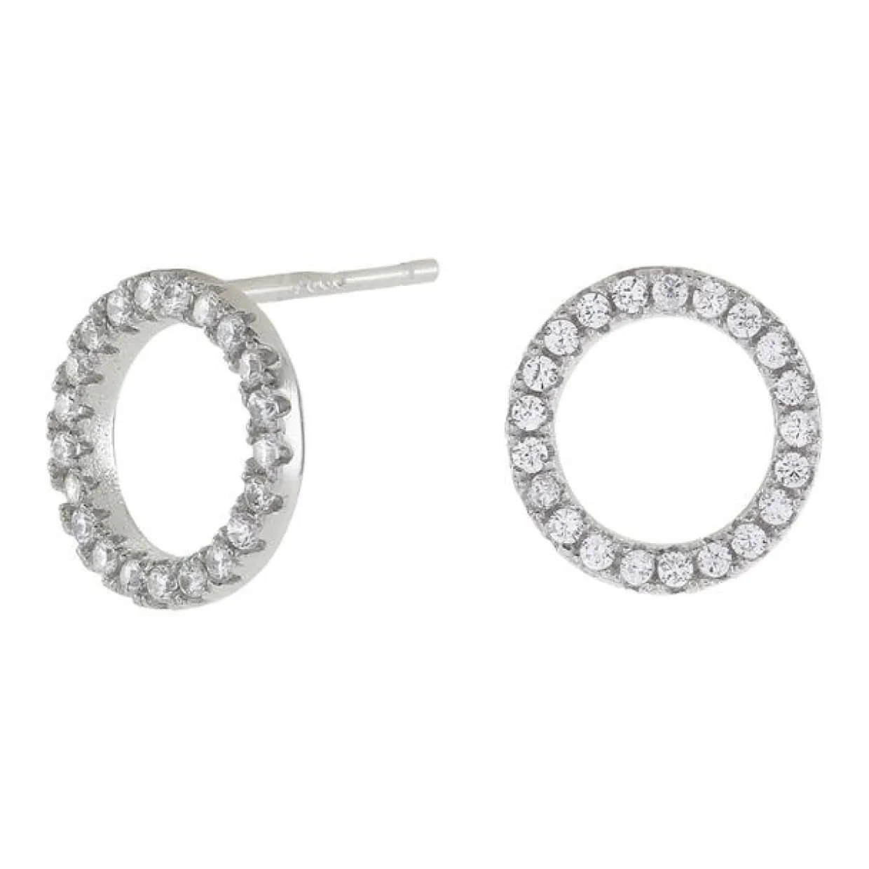 Sølv øreringe på stik med cirkel. Cirklen måler 10 mm i diameter og syntetiske zirkonia sidder rundt i kanten.