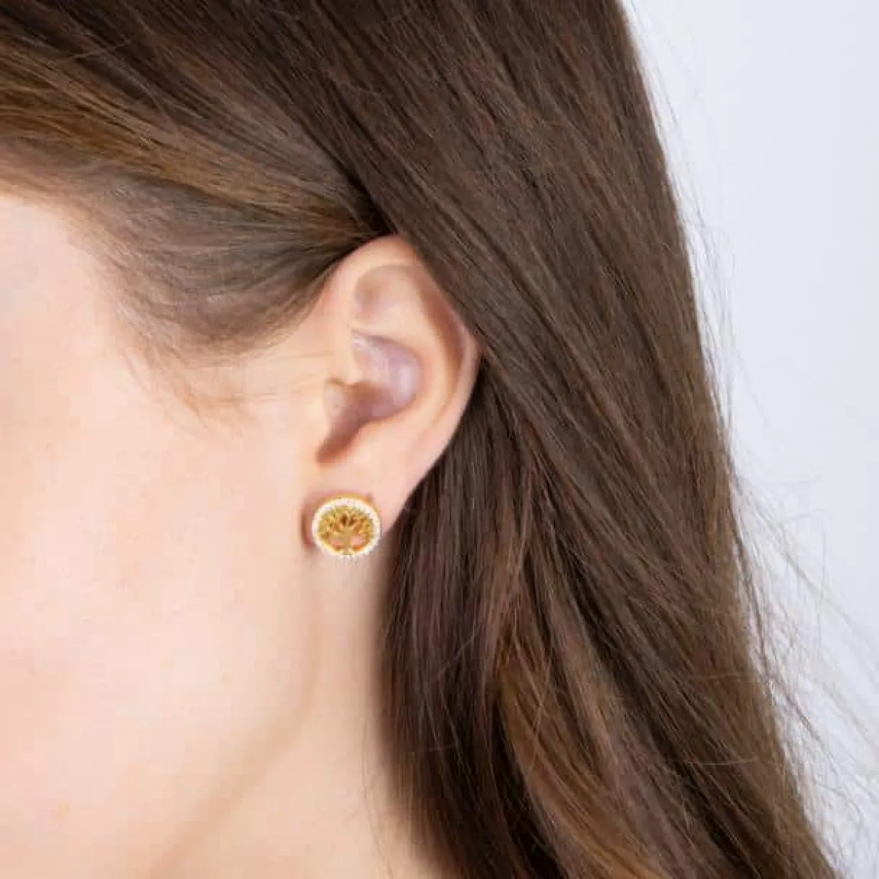 Sølv forgyldt øreringe på stik med livets træ. Øreringe 11 mm i diameter og der er syntetiske zirkonia rundt i kanten.
