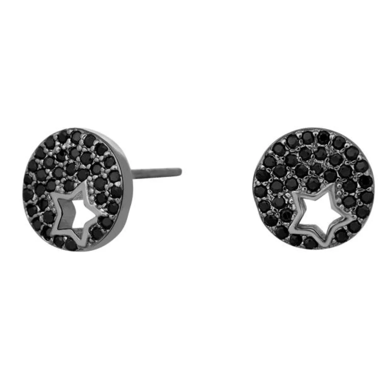Disse glimtende stjerne ørestikker er lavet i sort rhodineret sølv og besat med sorte kubisk zirkonia. Øreringe er en rundplade hvor der er udskåret en stjerne. De måler 9 mm i diameter.