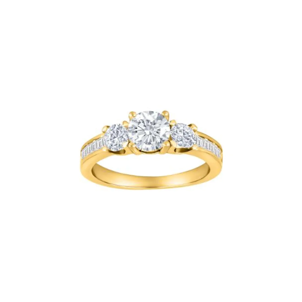 Denne smukke ring med 3 store sten i midten er lavet i sølv og forgyldt med 18 kt guld. Den største sten måler 6 mm i diameter og langs ringens sider er der isat firkantet sten. Overfladen er blank og alle sten er hvide kubisk zirkonia.