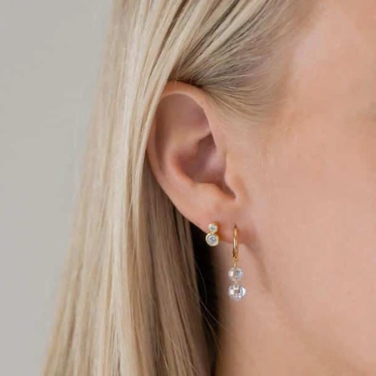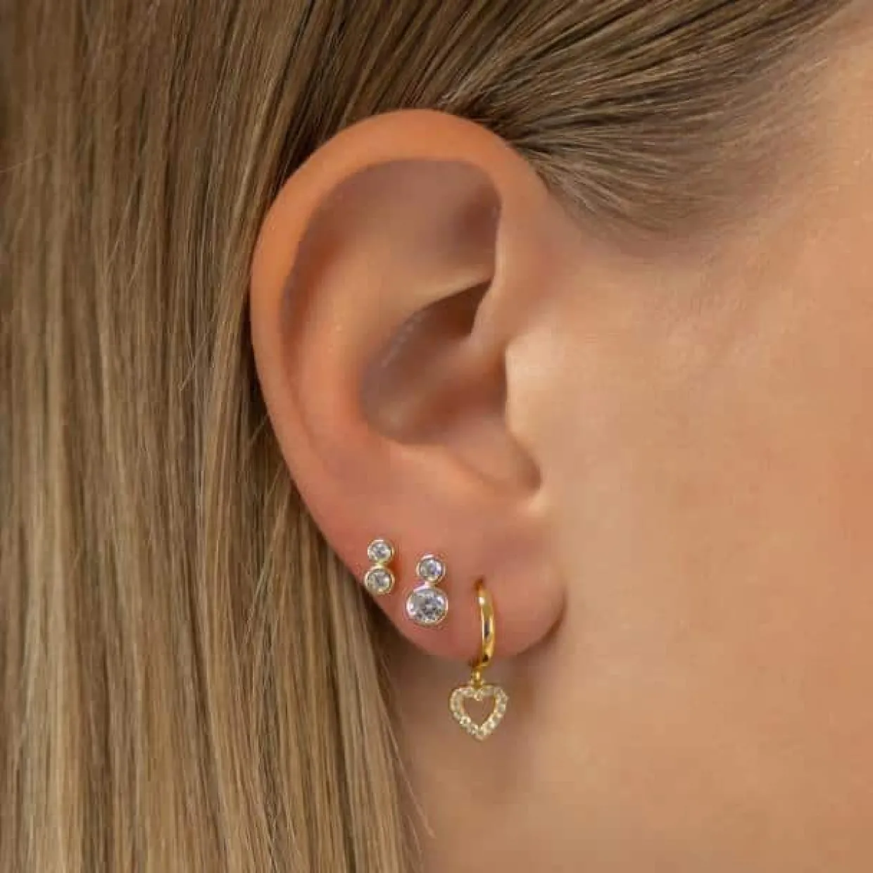 Sølv forgyldte øreringe stik med 2 styk syntetiske zirkonia i hver. Ørestikkerne måler 8,5 mm i højden og 5 mm i bredden. øreringene er forgyldt med en 18 karat forgyldning.