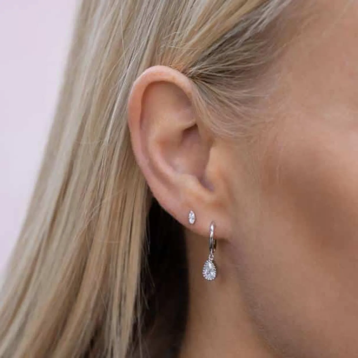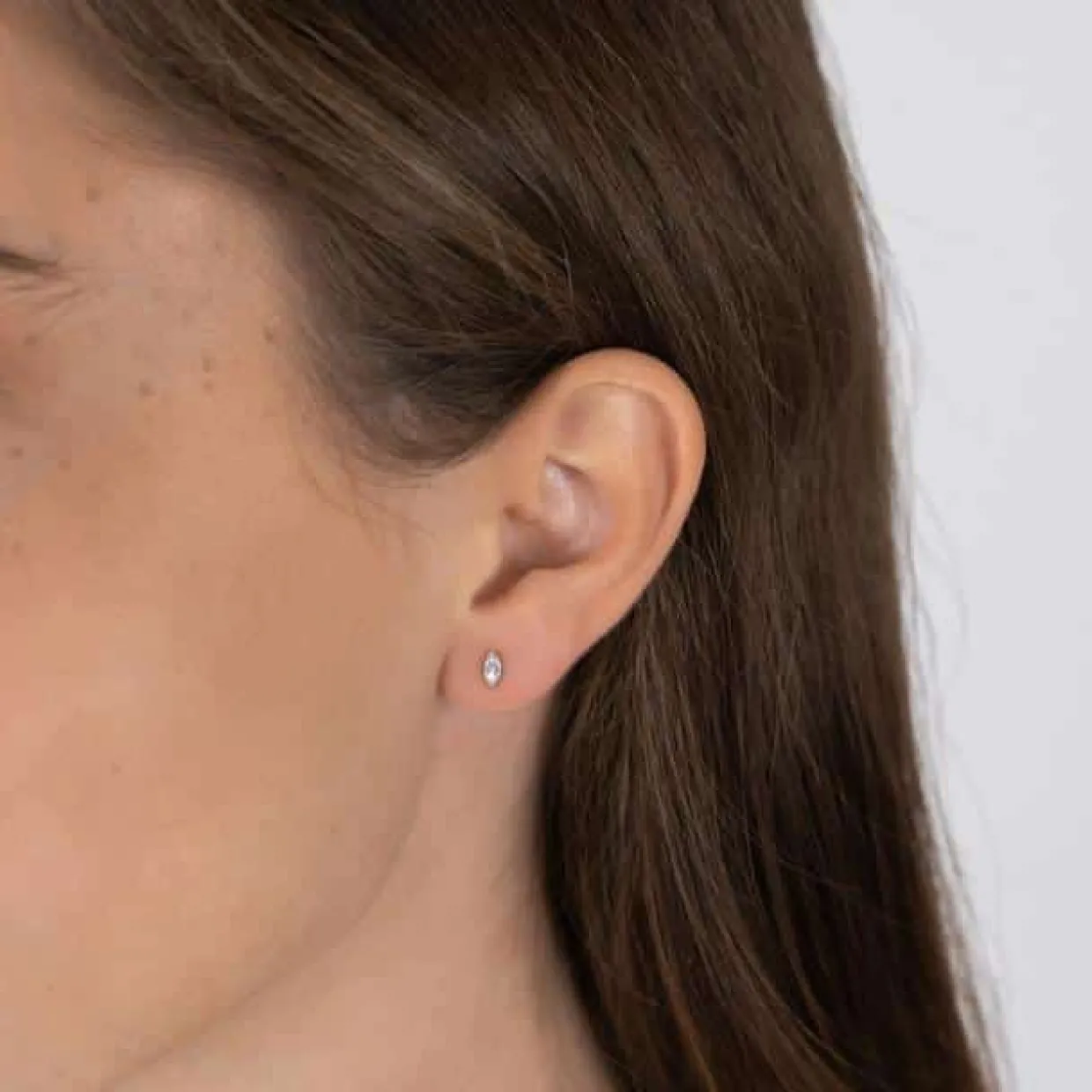 Sølv øreringe på stik med syntetisk zirkonia. Øreringene måler 5 mm i højden og 2 mm i bredden. Øreringene har fået en rhodinering.