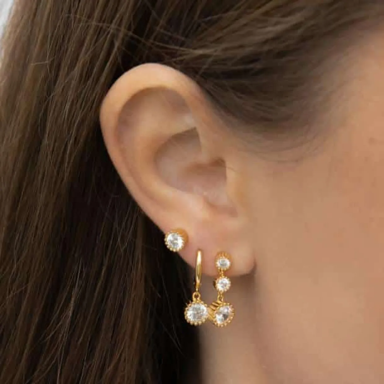 Fine ørestikker i forgyldt sølv fattet med en hvid kubisk zirkonia i en rørfatning. Diameter 5 mm. I serien findes også halskæde, armbånd og creoler.