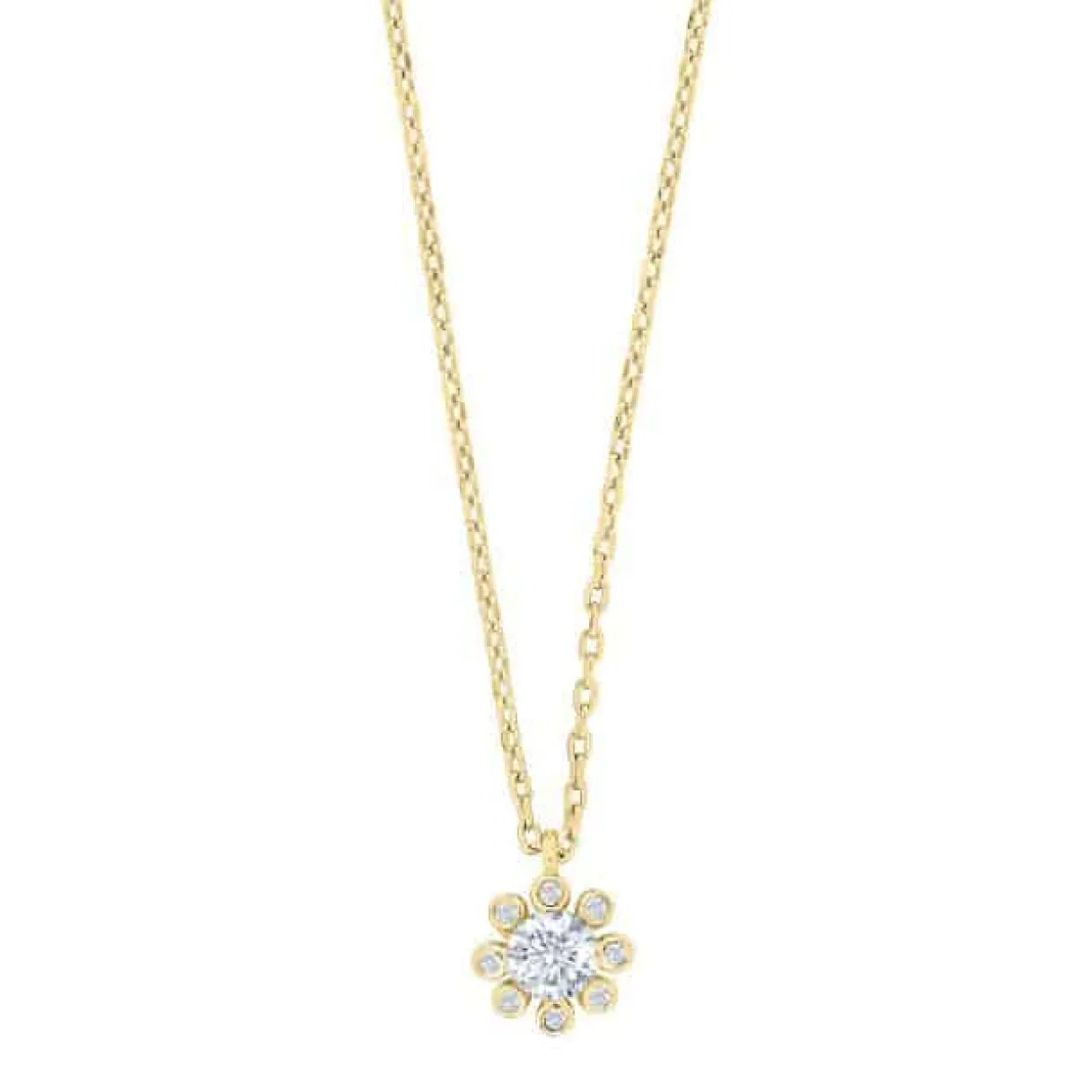 Denne smukke og feminine halskæde er fremstillet i forgyldt sterling sølv. I midten af vedhænget sidder en stor kubisk zirkonia, der er omkranset af otte kubisk zirkonia i rørfatning. Vedhænget sidder i en forgyldt sølv kæde på 42 cm + 3 cm.