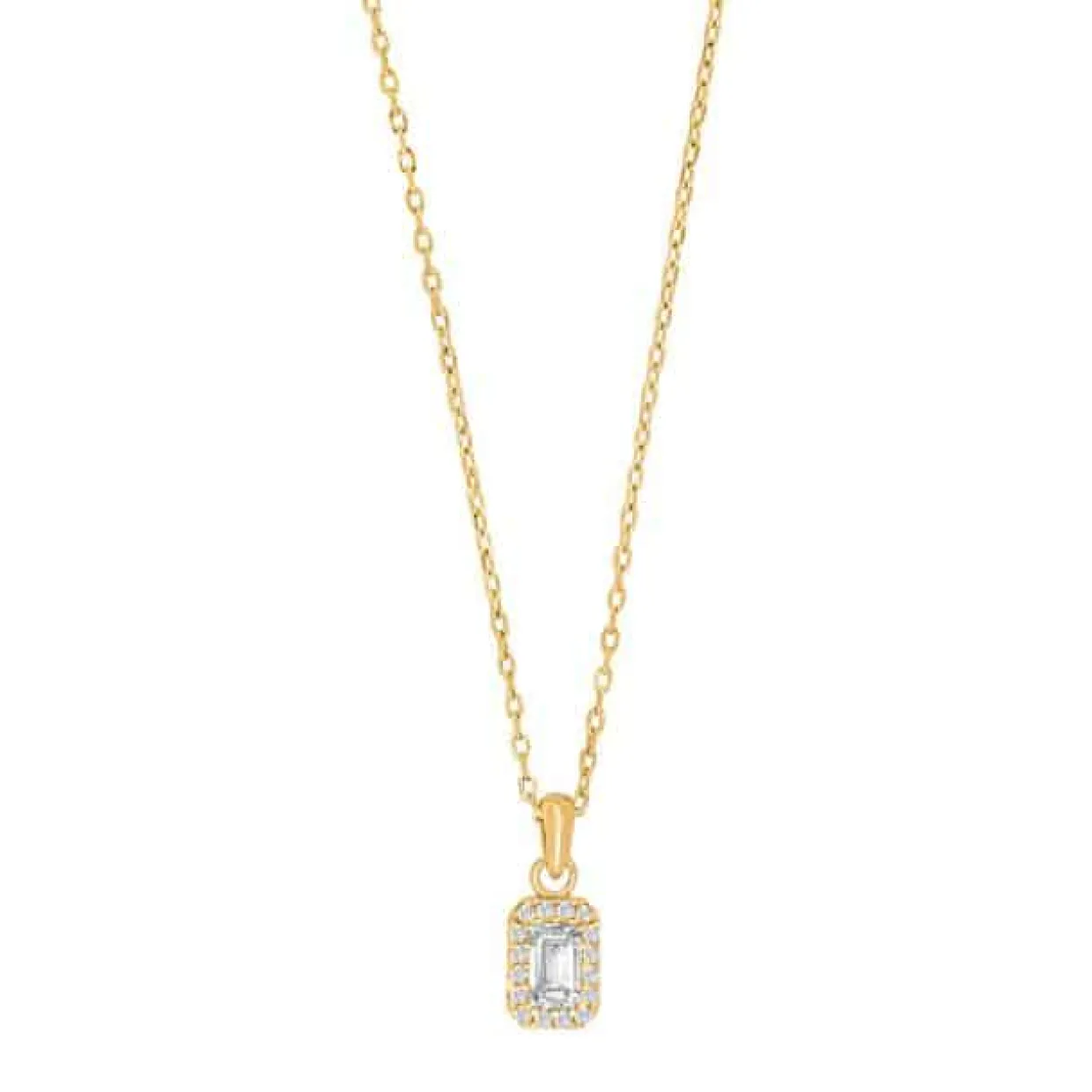 Sølv forgyldt halskæde med syntetiske zirkonia. Vedhænget målet 7 mm i højden og 5 mm i bredden. Kæden er en rund anker på 42+3 cm, som kan ombyttes efterfølgende.