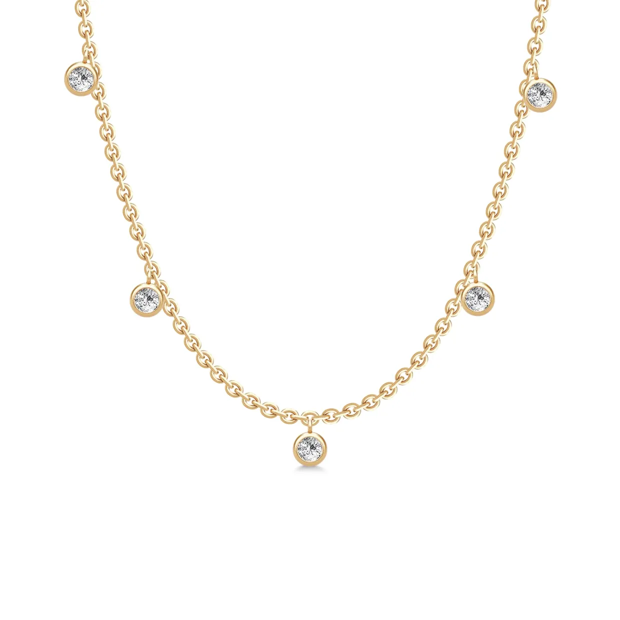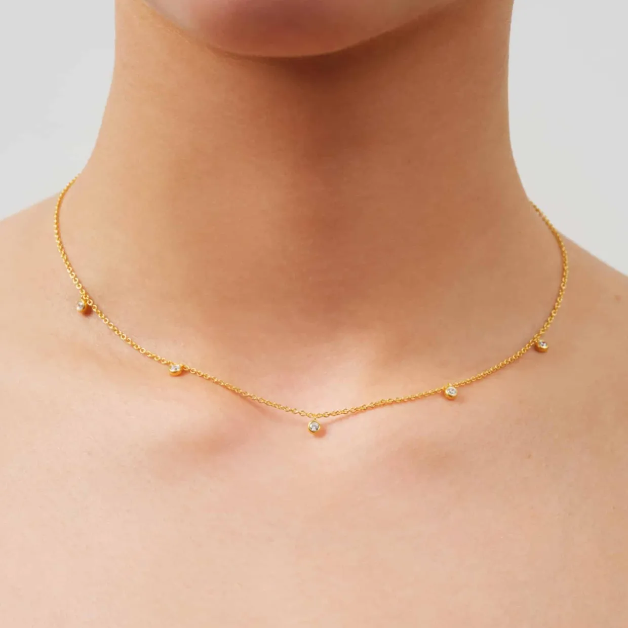 Rundt på halskæden sidder fem zirkonia i runde fatninger.