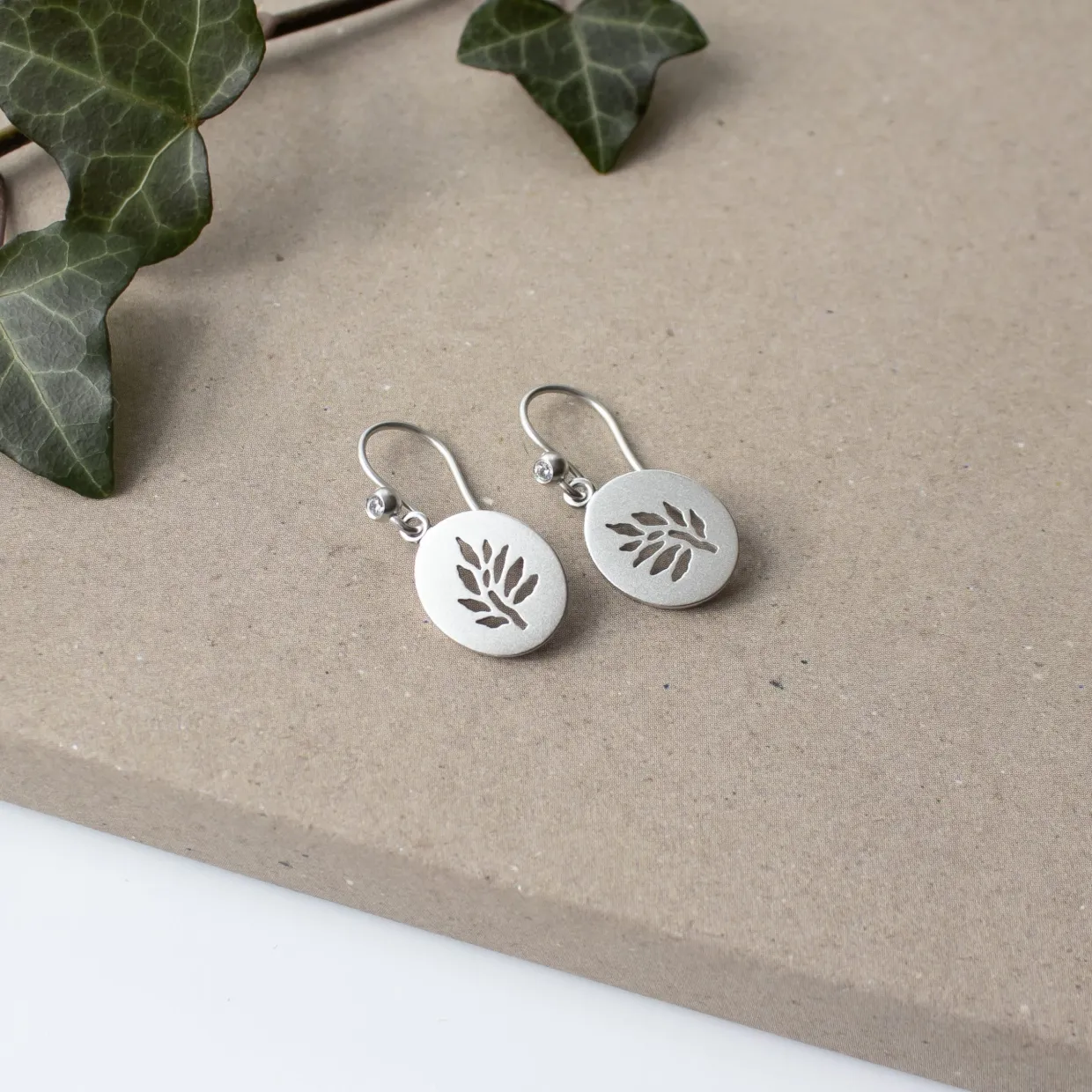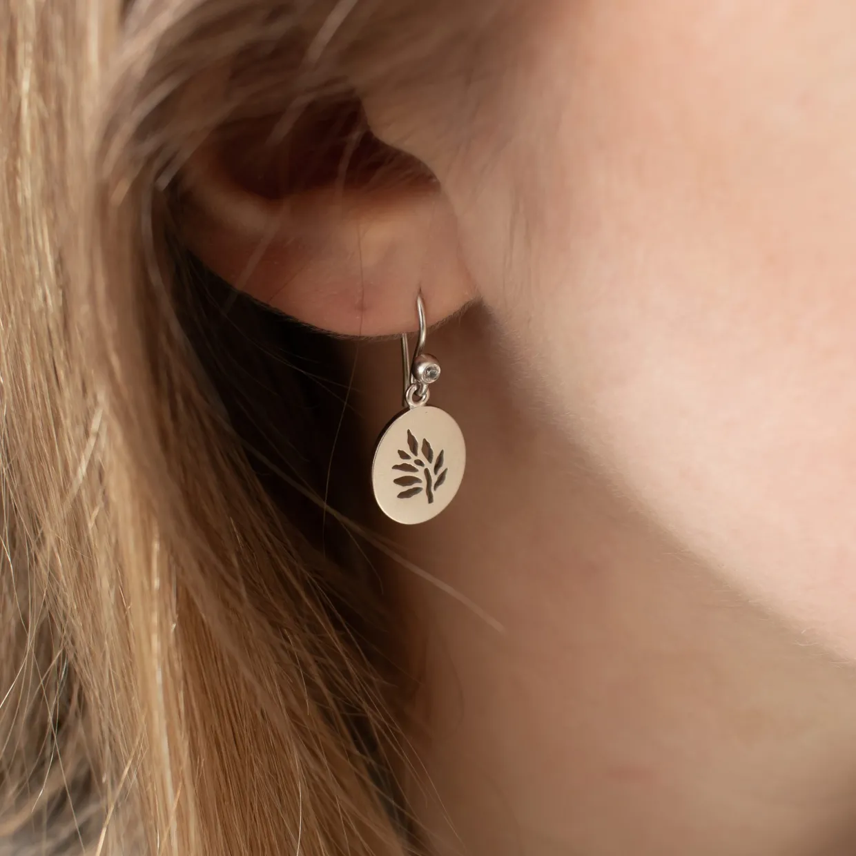 Øreringene er fremstillet i rhodineret sterlingsølv. I selve ørekrogen sidder en lille klar syntetisk zirkonia og ned fra hænger der et ovalt vedhæng med Julie Sandlaus logo, symbolet Livets Træ.