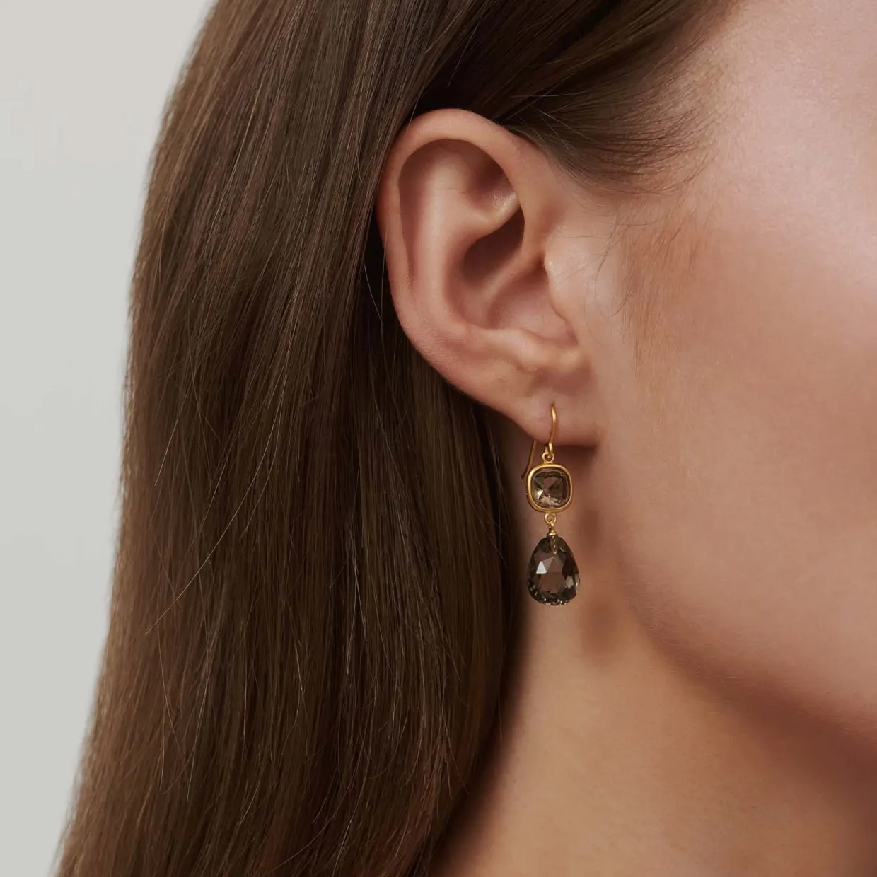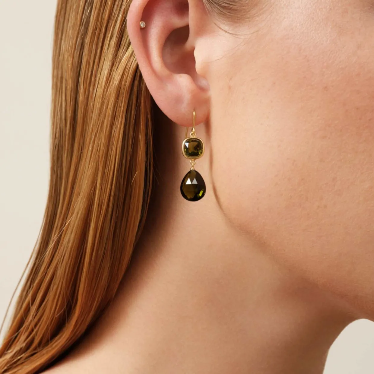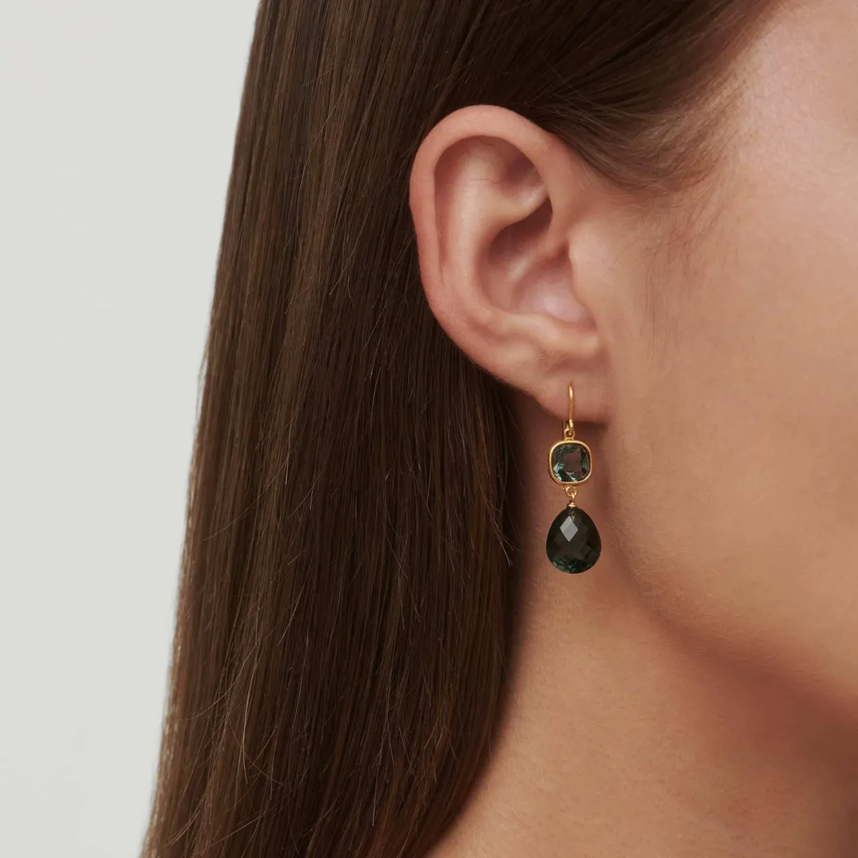 Et strejf af luksus og naturlig skønhed – Olivia øreringene fra Julie Sandlau kombinerer eksklusivt design med en sofistikeret farvetone. Øreringene er fremstillet i sterlingsølv og belagt med 22 karat guld, der giver en varm glød, mens den olivengrønne facetslebne krystal tilføjer et unikt og elegant farvespil.