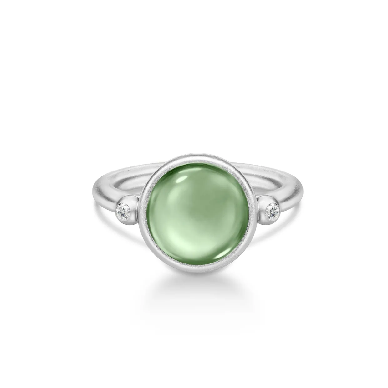 Denne elegante Prime ring er fremstillet i rhodineret sterlingsølv og har Julie Sandlaus karakteristiske satin finish. Stenen i midten er en grøn farvet krystal, som på hver side har to syntetiske klare zirkonia siddende.