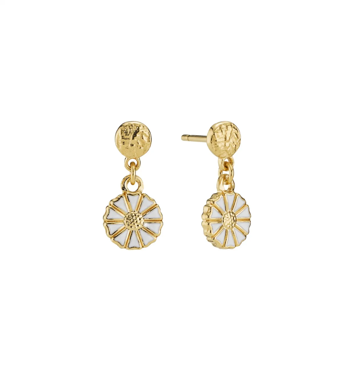 Disse klassiske ørestikker med marguerit vedhæng på 7 mm og rustik plade øverst er fremstillet i forgyldt sølv og hvid emalje. Der finde armbånd i samme design.