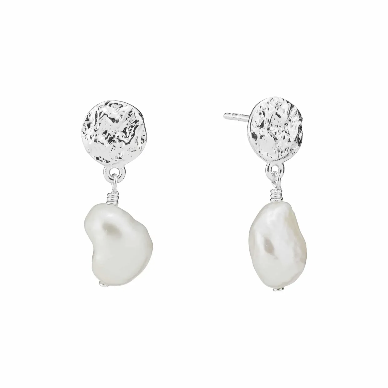 De sødeste Lund øreringe med en rustik rund plade på 8 mm, hvori der hænger den fineste lille ferskvandsperle.