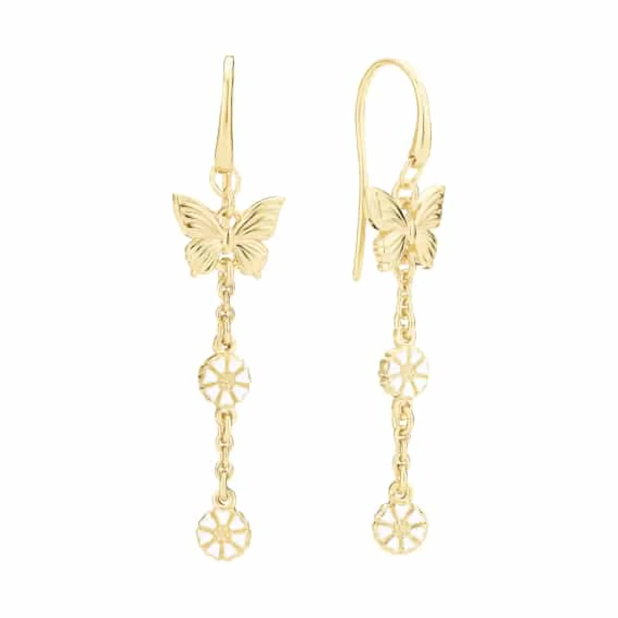 Flotte lange ørehænger med to margueritter og en sommerfugl på øret.