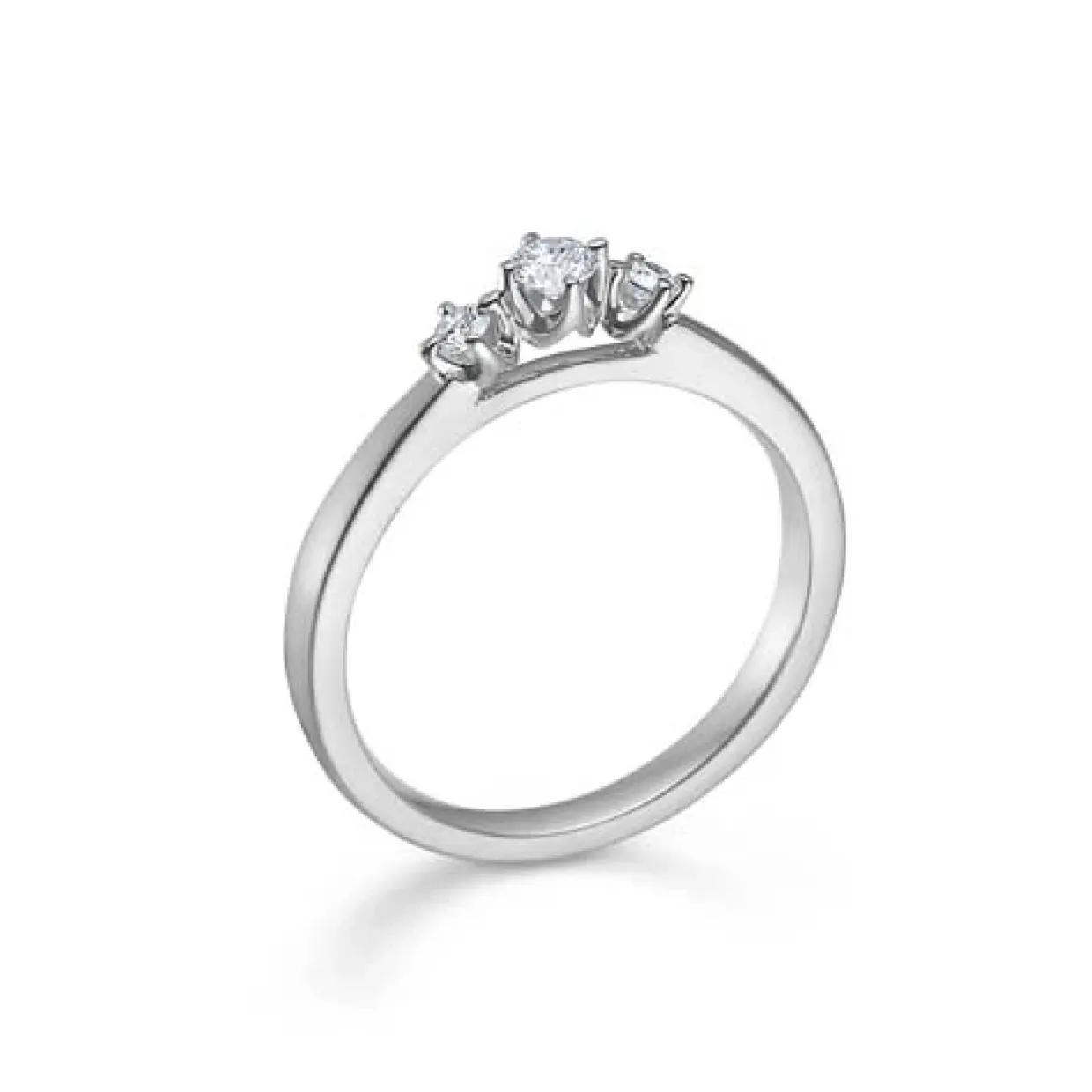 Ringen er i 14 karat hvidguld med 0,17 carat brillant fordelt på 3 brillanter. Brillanterne er drejet en halvt omgang, så det giver et helt andet udtryk end vi er vandt til så smyk. I Serien findes der også øreringe og vedhæng og laves også i rødguld.