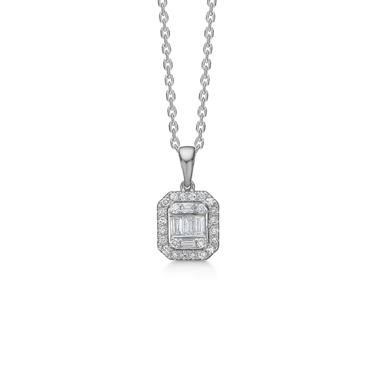 14 karat hvidguld vedhæng med diamanter på i alt 0,18 carat i kvaliteten wesselton/si. Vedhænget er fra serien ELIZABETH hvor der både findes øreringe og ring til. Til vedhænget følger en rhodineret rund anker sølv kæde i 45 cm.