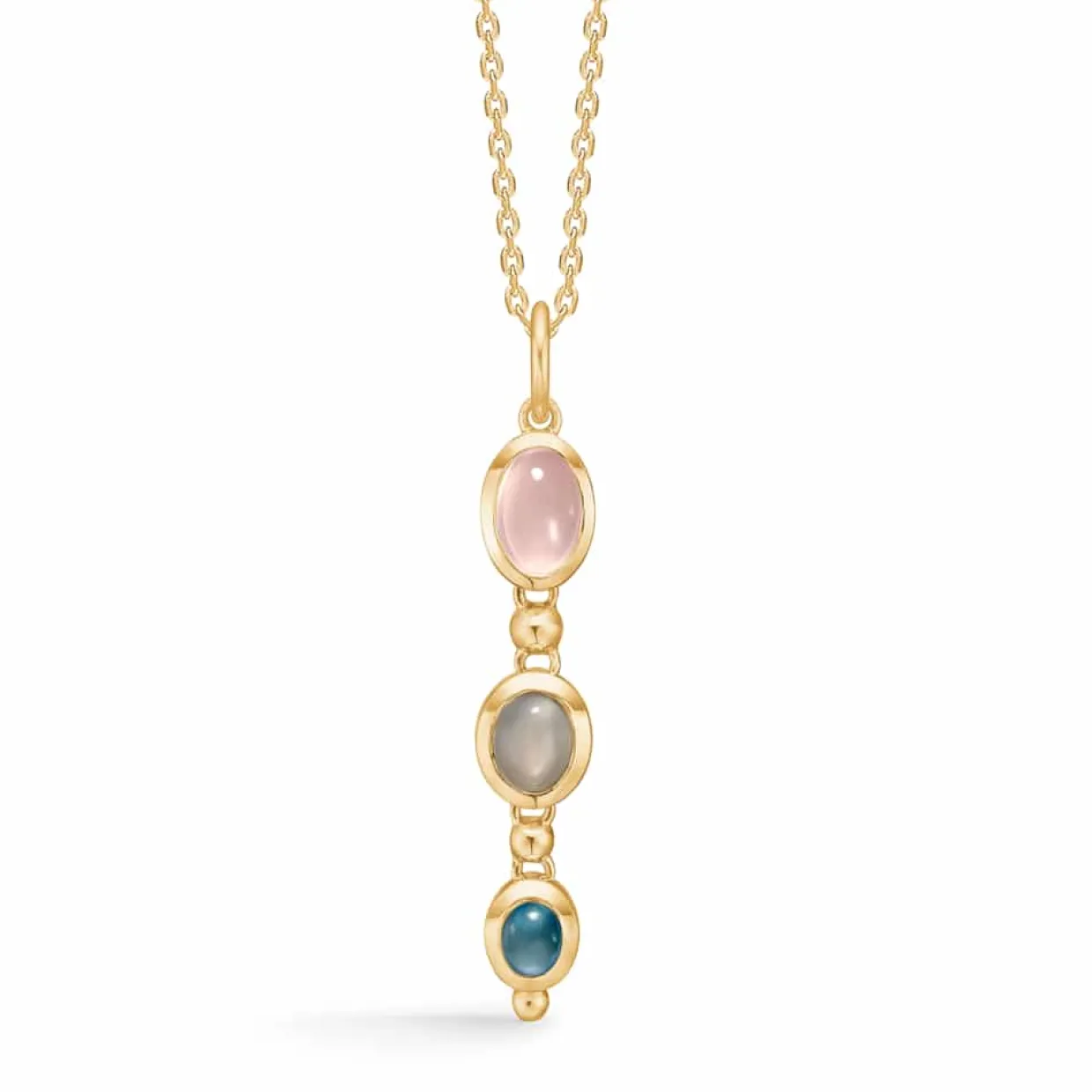 Florentina vedhænget er fremstillet i 14 karat guld med rosa rosakvarts, grå månesten og blå London Blue Topas.