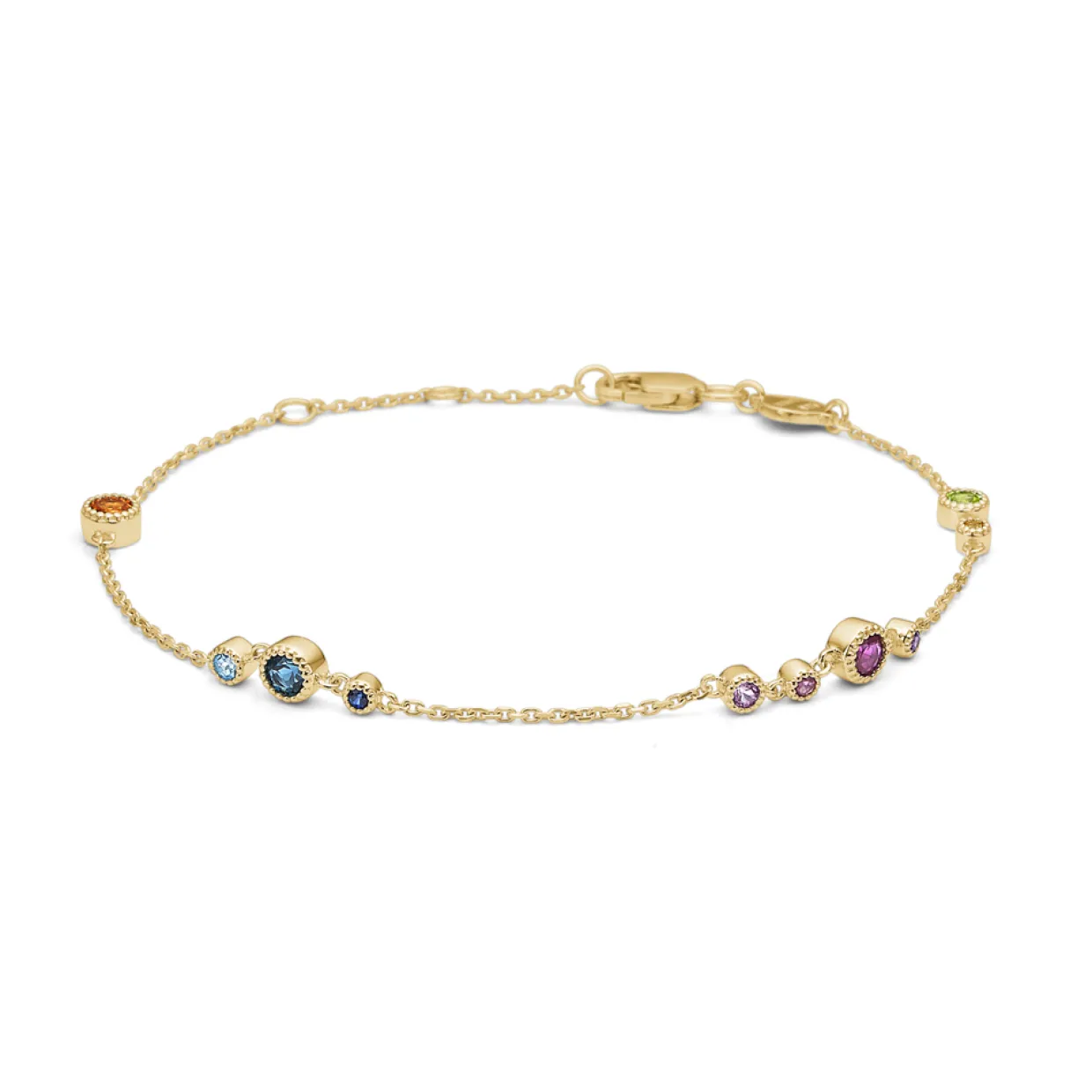 Armbånd i 14 karat guld med ægte stene. Stenene er blå topas, pink safir, grøn ceylon, blå safir og turmalin. Der finder også ring, øreringe og halskæde i serien. Armbåndet har et fantastisk farve spil. som skal opleves.