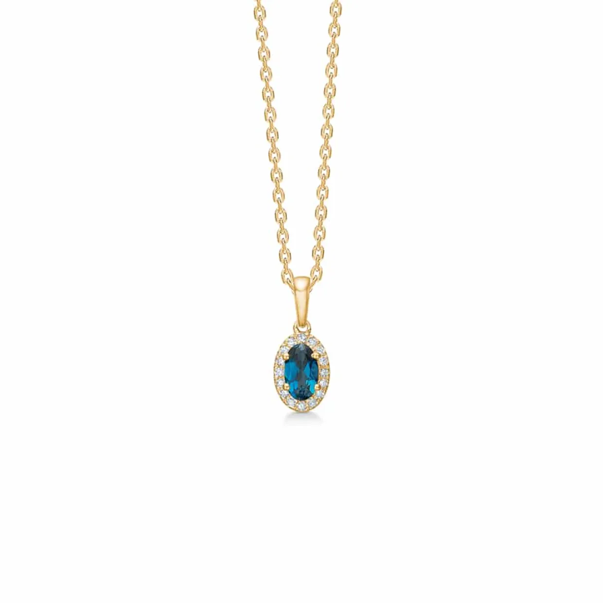 Vedhænget er i 14 karat guld med London blå topas og brillanter. Brillanter er på i alt 0,04 carat og i kvaliteten wesselton/si. Til vedhænget er der en sølv forgyldt kæde i 45 cm.