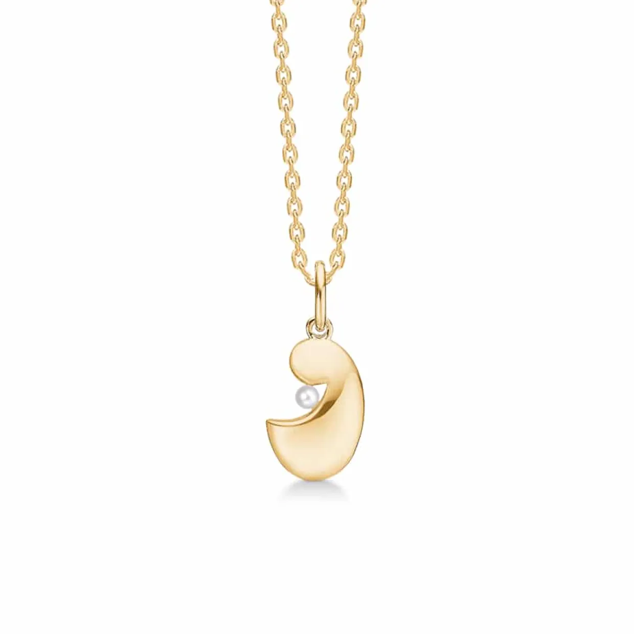 14 karat guld vedhæng med kultur perle. Vedhænget er fra serien MOTHER/CHILD og findes også i en størrelse større. Til vedhænget følger en sølv forgyldt rund anker kæde i tråd 0,40 mm og i en længde 45 cm.